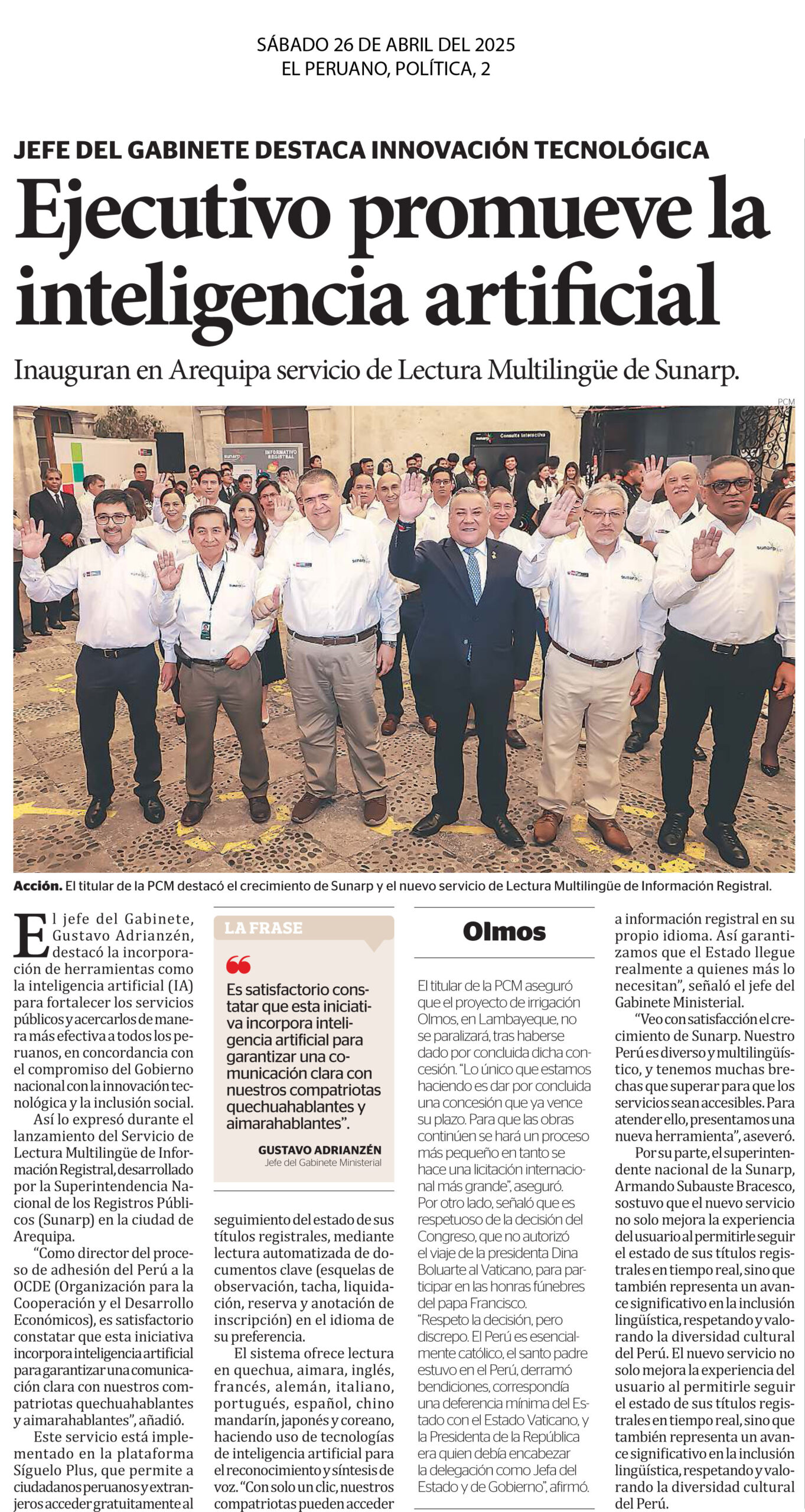 Ejecutivo promueve la inteligencia artificial El jefe del Gabinete, Gustavo Adrianzén, destacó la incorporación de herramientas como la inteligencia artificial (IA) para fortalecer los servicios públicos y acercarlos de manera más efectiva a todos los peruanos, en concordancia con el compromiso del Gobierno nacional con la innovación tecnológica y la inclusión social. Así lo expresó durante el lanzamiento del Servicio de Lectura Multilingüe de Información Registral, desarrollado por la Superintendencia Nacional de los Registros Públicos (Sunarp) en la ciudad de Arequipa. Por otro lado, el titular de la PCM aseguró que el proyecto de irrigación Olmos, en Lambayeque, no se paralizará, tras haberse dado por concluida dicha concesión. “Lo único que estamos haciendo es dar por concluida una concesión que ya vence su plazo. Para que las obras continúen se hará un proceso más pequeño en tanto se hace una licitación internacional más grande”, aseguró.