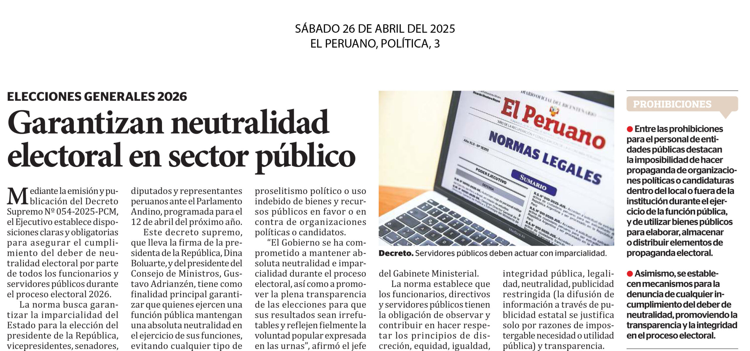 Garantizan neutralidad electoral en sector público Mediante la emisión y publicación del Decreto Supremo Nº 054-2025-PCM, el Ejecutivo establece disposiciones claras y obligatorias para asegurar el cumplimiento del deber de neutralidad electoral por parte de todos los funcionarios y servidores públicos durante el proceso electoral 2026. La norma busca garantizar la imparcialidad del Estado para la elección del presidente de la República, vicepresidentes, senadores, diputados y representantes peruanos ante el Parlamento Andino, programada para el 12 de abril del próximo año. Este decreto supremo, que lleva la firma de la presidenta de la República, Dina Boluarte, y del presidente del Consejo de Ministros, Gustavo Adrianzén. El Peruano, Política, 3