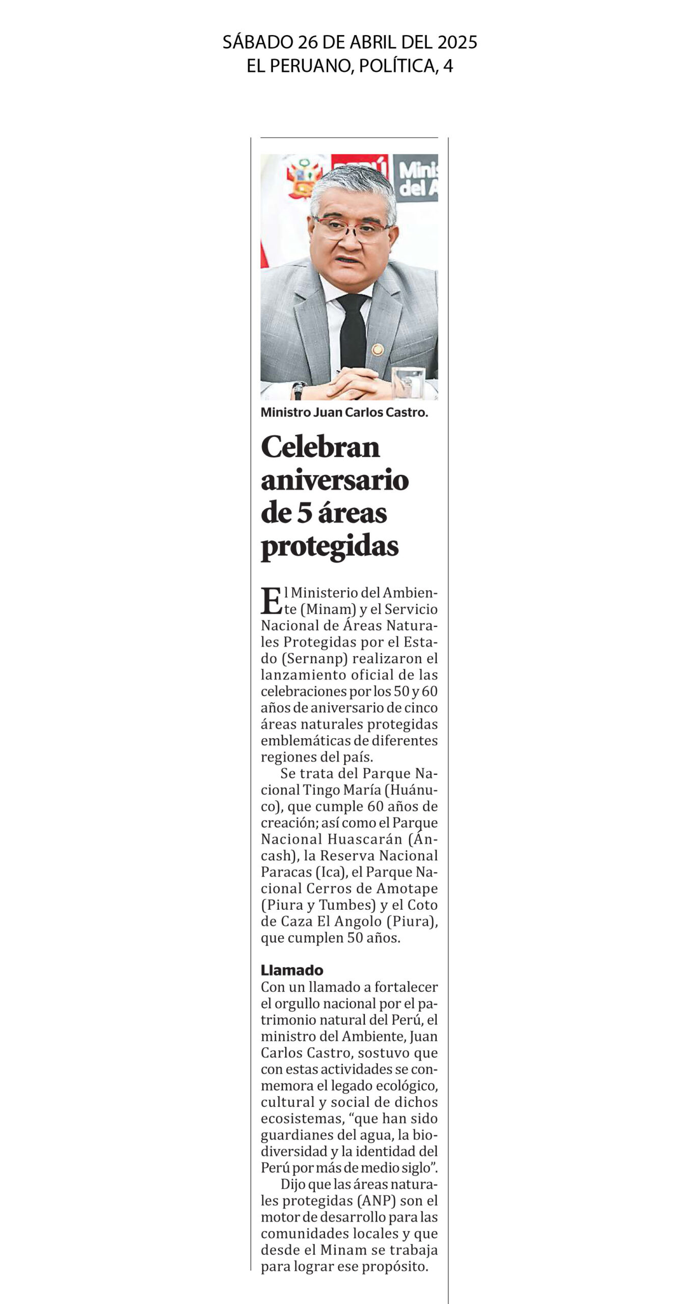 Celebran aniversario de 5 áreas protegidas El Ministerio del Ambiente (Minam) y el Servicio Nacional de Áreas Naturales Protegidas por el Estado (Sernanp) realizaron el lanzamiento oficial de las celebraciones por los 50 y 60 años de aniversario de cinco áreas naturales protegidas emblemáticas de diferentes regiones del país. Se trata del Parque Nacional Tingo María (Huánuco), que cumple 60 años de creación; así como el Parque Nacional Huascarán (Áncash), la Reserva Nacional Paracas (Ica), el Parque Nacional Cerros de Amotape (Piura y Tumbes) y el Coto de Caza El Angolo (Piura), que cumplen 50 años.