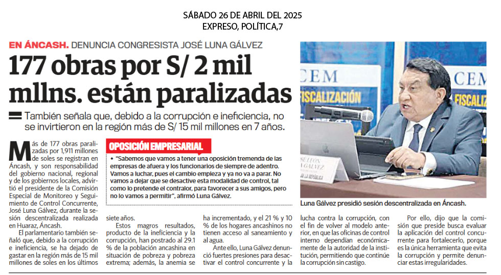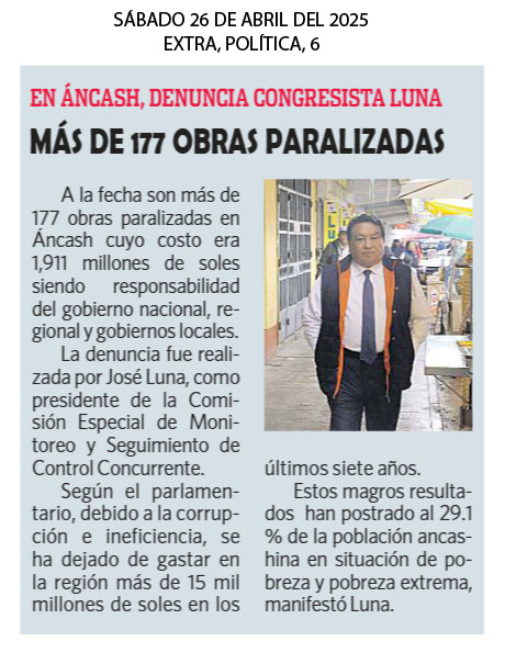 177 obras por S/ 2 mil mlls. están paralizadas Más de 177 obras paralizadas por 1,911 millones de soles se registran en Áncash, y son responsabilidad del gobierno nacional, regional y de los gobiernos locales, advirtió el presidente de la Comisión Especial de Monitoreo y Seguimiento de Control Concurrente, José Luna Gálvez, durante la sesión descentralizada realizada en Huaraz, Áncash. El parlamentario también señaló que, debido a la corrupción e ineficiencia, se ha dejado de gastar en la región más de 15 mil millones de soles en los últimos siete años. Estos magros resultados, producto de la ineficiencia y la corrupción, han postrado al 29.1 % de la población ancashina en situación de pobreza y pobreza extrema; además, la anemia se ha incrementado, y el 21 % y 10 % de los hogares ancashinos no tienen acceso al saneamiento y al agua. |