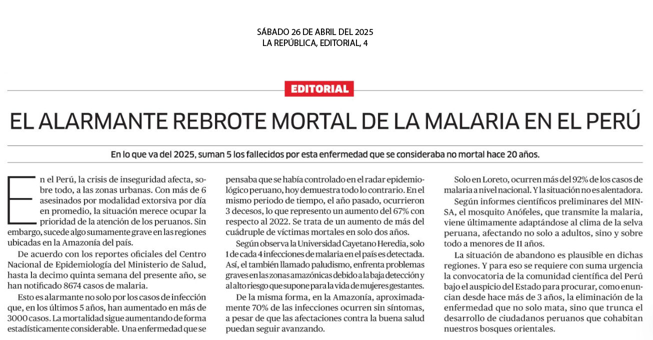 El alarmante rebrote mortal de la malaria en el Perú En el Perú, la crisis de inseguridad afecta, sobre todo, a las zonas urbanas. Con más de 6 asesinados por modalidad extorsiva por día en promedio, la situación merece ocupar la prioridad de la atención de los peruanos. Sin embargo, sucede algo sumamente grave en las regiones ubicadas en la Amazonía del país.De acuerdo con los reportes oficiales del Centro Nacional de Epidemiología del Ministerio de Salud, hasta la decimo quinta semana del presente año, se han notificado 8674 casos de malaria. Esto es alarmante no solo por los casos de infección que, en los últimos 5 años, han aumentado en más de 3000 casos. La mortalidad sigue aumentando de forma estadísticamente considerable.