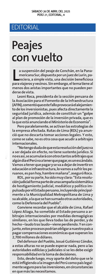 Peajes con vuelto La suspensión del peaje de Conchán, en la Panamericana Sur, dispuesta por un juez de Lurín, pareciera, a simple vista, una decisión beneficiosa para viajeros y vecinos. Sin embargo, el tema tiene al menos dos aristas importantes que no pueden perderse de vista. Leoni Roca, presidenta de la sección peruana de la Asociación para el Fomento de la Infraestructura (AFIN), comentó que este fallo provocará el alejamiento de los inversionistas, pues afecta directamente la seguridad jurídica, además de constituir un “golpe al plan de promoción de la inversión privada, que es la que está anunciando el Ministerio de Economía”. |