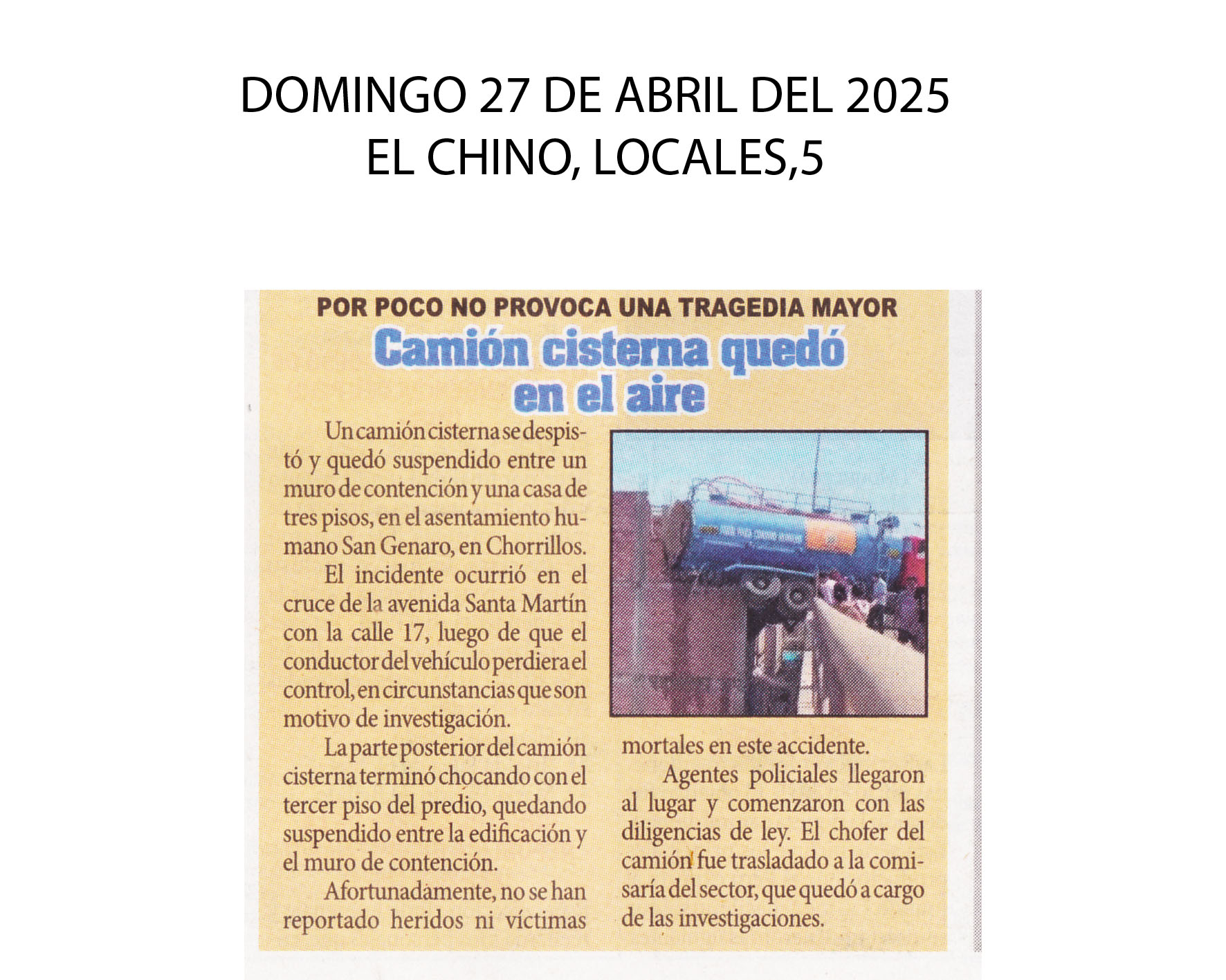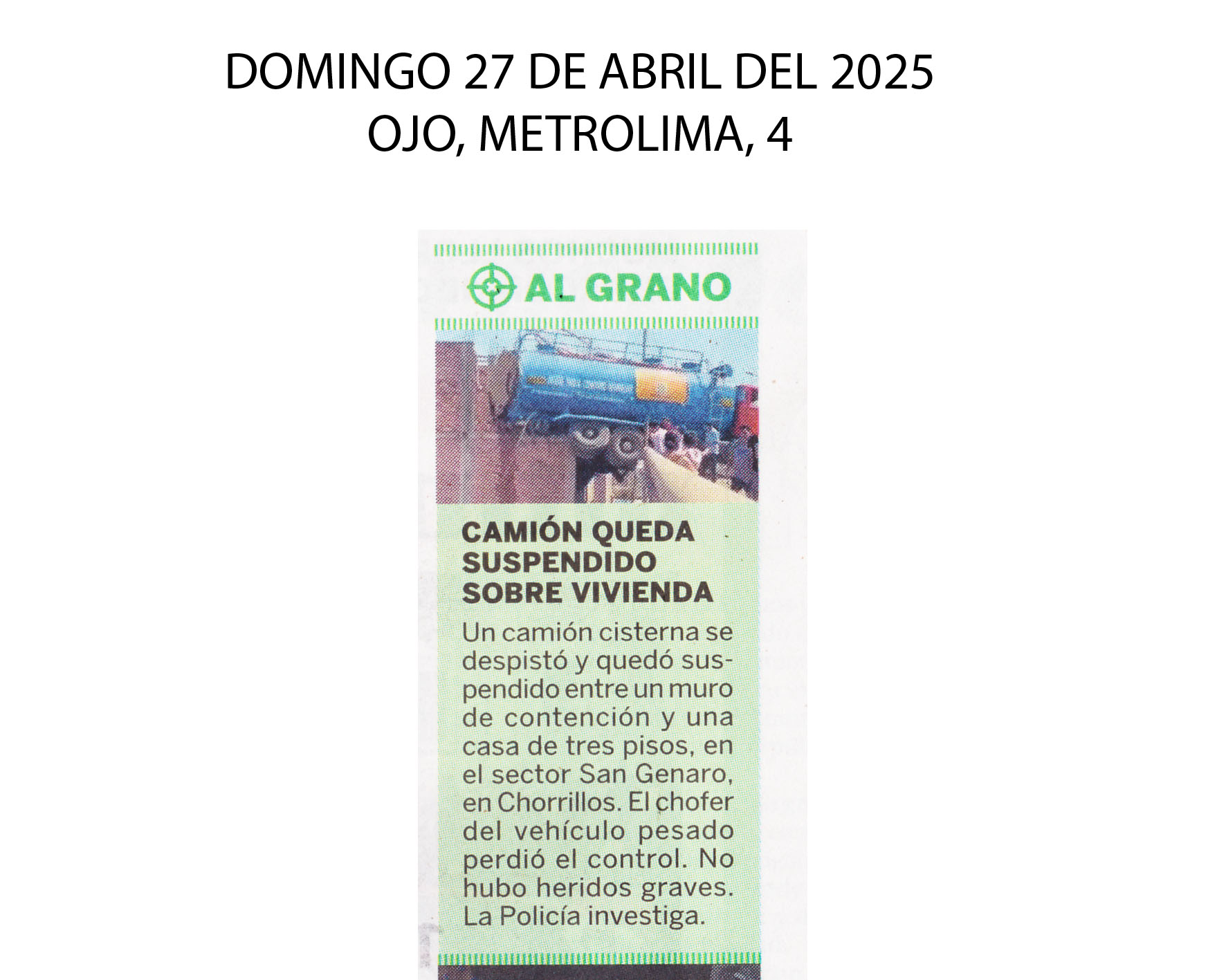 Camión cisterna quedó en el aire Un camión cisterna se despistó y quedó suspendido entre un muro de contención y una casa de tres pisos, en el asentamiento humano San Genaro, en Chorrillos. El incidente ocurrió en el cruce de la avenida Santa Martín con la calle 17, luego de que el conductor del vehículo perdiera el control, en circunstancias que son motivo de investigación. La parte posterior del camión cisterna terminó chocando con el tercer piso del predio, quedando suspendido entre la edificación y el muro de contención. Afortunadamente, no se han reportado heridos ni víctimas mortales en este accidente. Agentes policiales llegaron al lugar y comenzaron con las diligencias de ley. El chofer del camión fue trasladado a la comisaría del sector, que quedó a cargo de las investigaciones. |