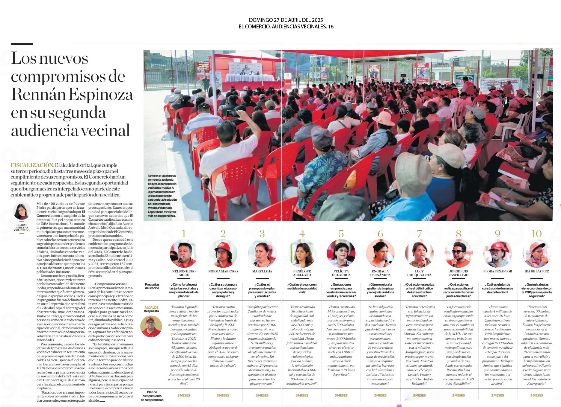 Los nuevos compromisos de Renán Espinoza en su segunda audiencia vecinal El alcalde distrital, que cumple su tercer período, dio hasta tres meses de plazo para el cumplimiento de sus compromisos. El Comercio hará un seguimiento de cada respuesta. Es la segunda oportunidad que el burgomaestre es interpelado como parte de este emblemático programa de participación democrática. Más de 400 vecinos de Puente Piedra participaron ayer en la audiencia vecinal organizada por El Comercio, con el auspicio dela empresa PIuz y el apoyo técnico de IDEA internacional. Se trata de la primera vez que una autoridad municipal acepta someterse nuevamente a una interpelación pública sobre las acciones que realiza sugestión para atender problemas corno la falta de acceso a servicios básicos, limitados espacios verdes, poca infraestructura educativa o inseguridad ciudadana que aquejan al distrito que supera los 400.000 habitantes ,en uno de los más poblados de Lima norte El Comercio, Audiencias Vecinales, 16