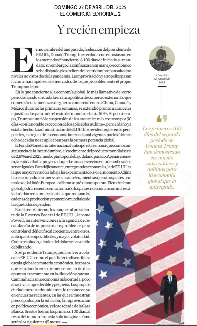 Y recién empieza En noviembre del año pasado, la elección del presidente de EE.UU., Donald Trump, fue recibida con entusiasmo en los mercados financieros. A 100 días de iniciado su mandato, sin embargo, la confianza en su manejo económico se ha disipado y los índices de incertidumbre han saltado a niveles no vistos desde la pandemia. La improvisación y atropellos pasan factura más rápido en los mercados de lo que probablemente el propio Trump anticipó. En lo que concierne a la economía global, lo más llamativo del corto período ha sido sin duda la errática política de comercio exterior. Lo que comenzó con amenazas de guerra comercial contra China, Canadá y México durante las primeras semanas, se extendió pronto a aranceles injustificados para todo el resto del mundo de hasta 50%. Al poco tiempo, Trump anunció la suspensión de los aranceles más costosos por 90 días –con la notable excepción de los aplicables a China–, pero el daño ya estaba hecho. La administración de EE.UU. hizo evidente que, en su perspectiva, las reglas de la economía internacional vigentes por las últimas ocho décadas no se aplicaban para la primera potencia global.