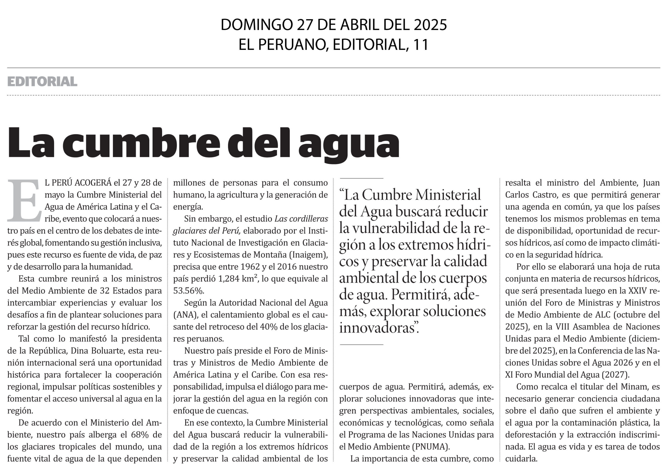 La cumbre del agua Editorial El Peruano. “El Perú acogerá el 27 y 28 de mayo la Cumbre Ministerial del Agua de América Latina y el Caribe, evento que colocará a nuestro país en el centro de los debates de interés global, fomentando su gestión inclusiva, pues este recurso es fuente de vida, de paz y de desarrollo para la humanidad. Esta cumbre reunirá a los ministros del Medio Ambiente de 32 Estados para intercambiar experiencias y evaluar los desafíos a fin de plantear soluciones para reforzar la gestión del recurso hídrico. Tal como lo manifestó la presidenta de la República, Dina Boluarte, esta reunión internacional será una oportunidad histórica para fortalecer la cooperación regional, impulsar políticas sostenibles y fomentar el acceso universal al agua en la región…”.