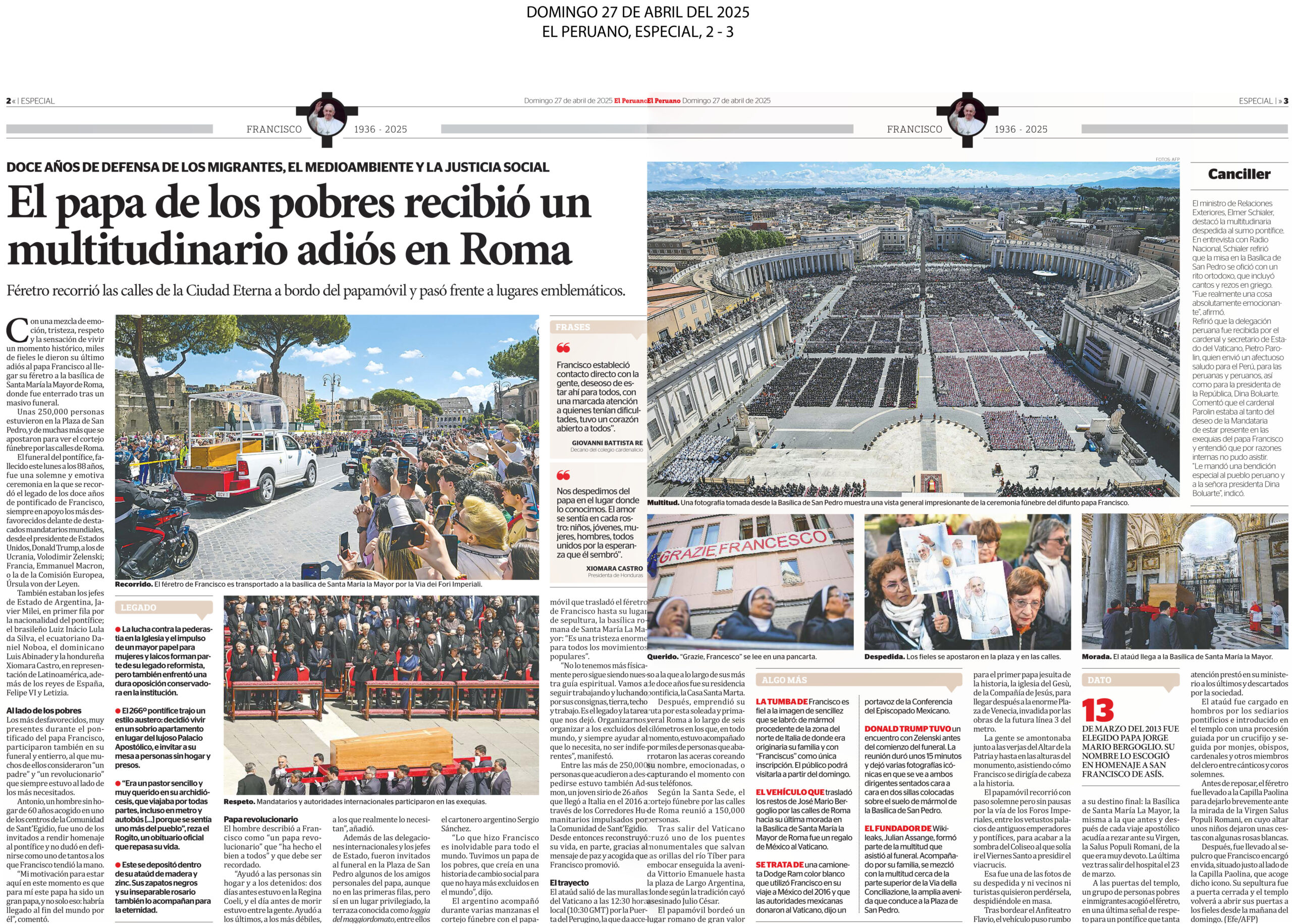 El papa de los pobres recibió un multitudinario adiós en Roma Con una mezcla de emoción, tristeza, respeto y la sensación de vivir un momento histórico, miles de fieles le dieron su último adiós al papa Francisco al llegar su féretro a la basílica de Santa María la Mayor de Roma, donde fue enterrado tras un masivo funeral. Unas 250,000 personas estuvieron en la Plaza de San Pedro, y de muchas más que se apostaron para ver el cortejo fúnebre por las calles de Roma. El funeral del pontífice, fallecido este lunes a los 88 años, fue una solemne y emotiva ceremonia en la que se recordó el legado de los doce años de pontificado de Francisco, siempre en apoyo los más desfavorecidos delante de destacados mandatarios mundiales, desde el presidente de Estados Unidos, Donald Trump, a los de Ucrania, Volodimir Zelenski; Francia, Emmanuel Macron, o la de la Comisión Europea, Úrsula von der Leyen.