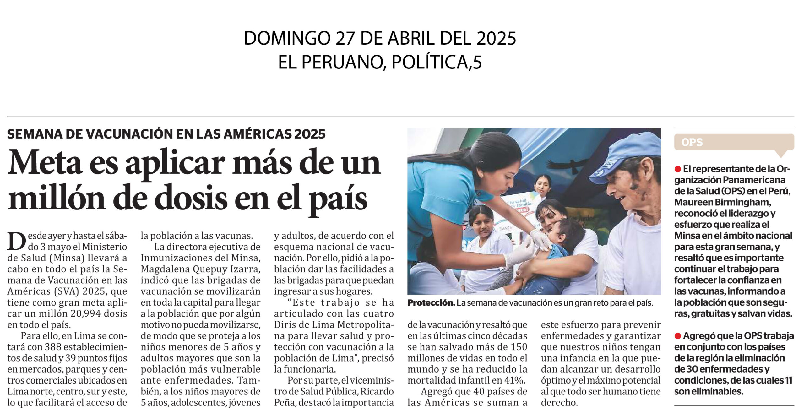 Meta es aplicar más de un millón de dosis en el país Desde ayer y hasta el sábado 3 mayo el Ministerio de Salud (Minsa) llevará a cabo en todo el país la Semana de Vacunación en las Américas (SVA) 2025, que tiene como gran meta aplicar un millón 20,994 dosis en todo el país. Para ello, en Lima se contará con 388 establecimientos de salud y 39 puntos fijos en mercados, parques y centros comerciales ubicados en Lima norte, centro, sur y este, lo que facilitará el acceso de la población a las vacunas. La directora ejecutiva de Inmunizaciones del Minsa, Magdalena Quepuy Izarra, indicó que las brigadas de vacunación se movilizarán en toda la capital para llegar a la población que por algún motivo no pueda movilizarse, de modo que se proteja a los niños menores de 5 años y adultos mayores que son la población más vulnerable ante enfermedades. El Peruano, Política, Política, 5