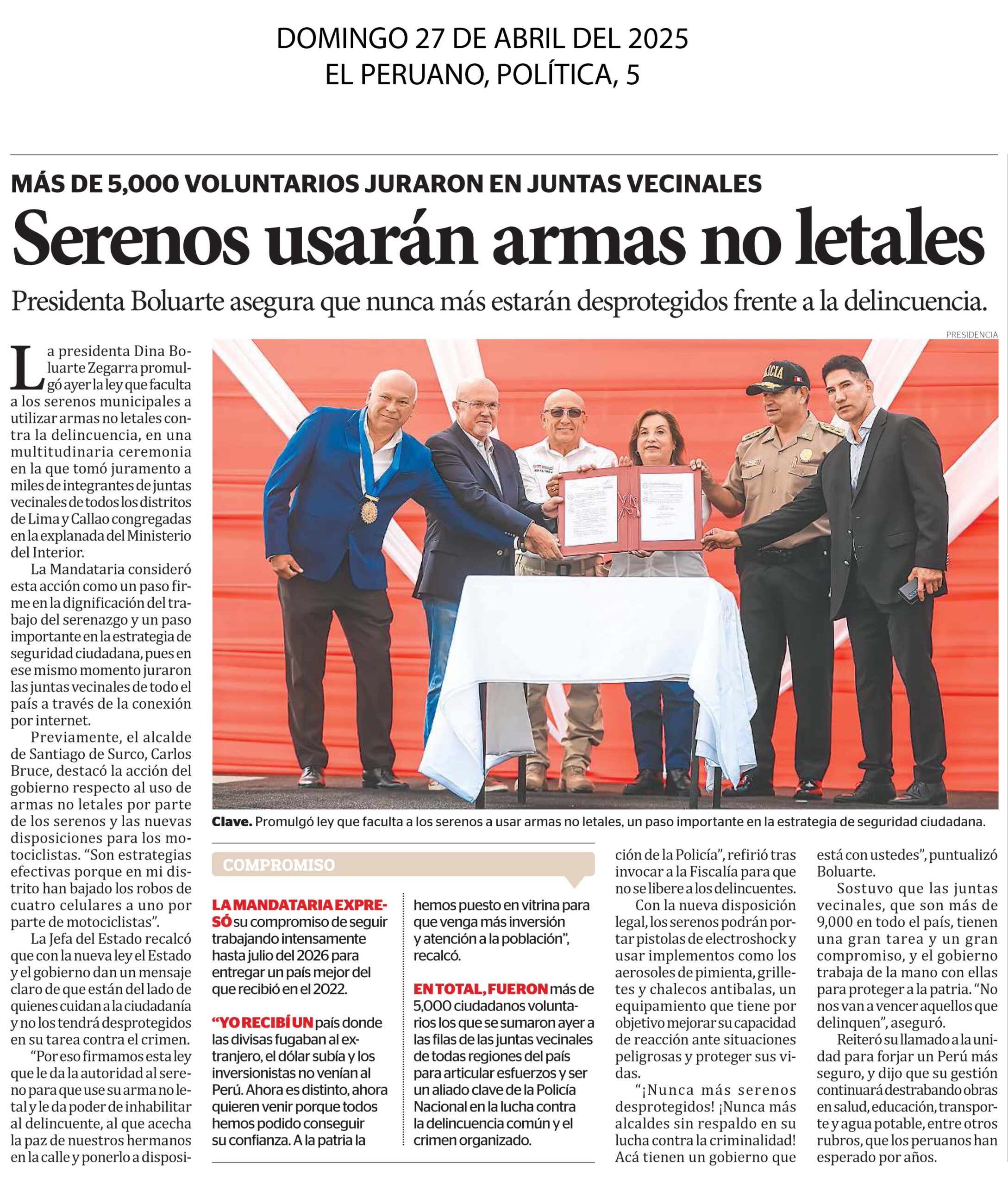 Serenos usarán armas no letales La presidenta Dina Boluarte Zegarra promulgó ayer la ley que faculta a los serenos municipales a utilizar armas no letales contra la delincuencia, en una multitudinaria ceremonia en la que tomó juramento a miles de integrantes de juntas vecinales de todos los distritos de Lima y Callao congregadas en la explanada del Ministerio del Interior. La Mandataria consideró esta acción como un paso firme en la dignificación del trabajo del serenazgo y un paso importante en la estrategia de seguridad ciudadana, pues en ese mismo momento juraron las juntas vecinales de todo el país a través de la conexión por internet. La Jefa del Estado recalcó que con la nueva ley el Estado y el gobierno dan un mensaje claro de que están del lado de quienes cuidan a la ciudadanía y no los tendrá desprotegidos en su tarea contra el crimen. El Peruano, Política, Política, 5