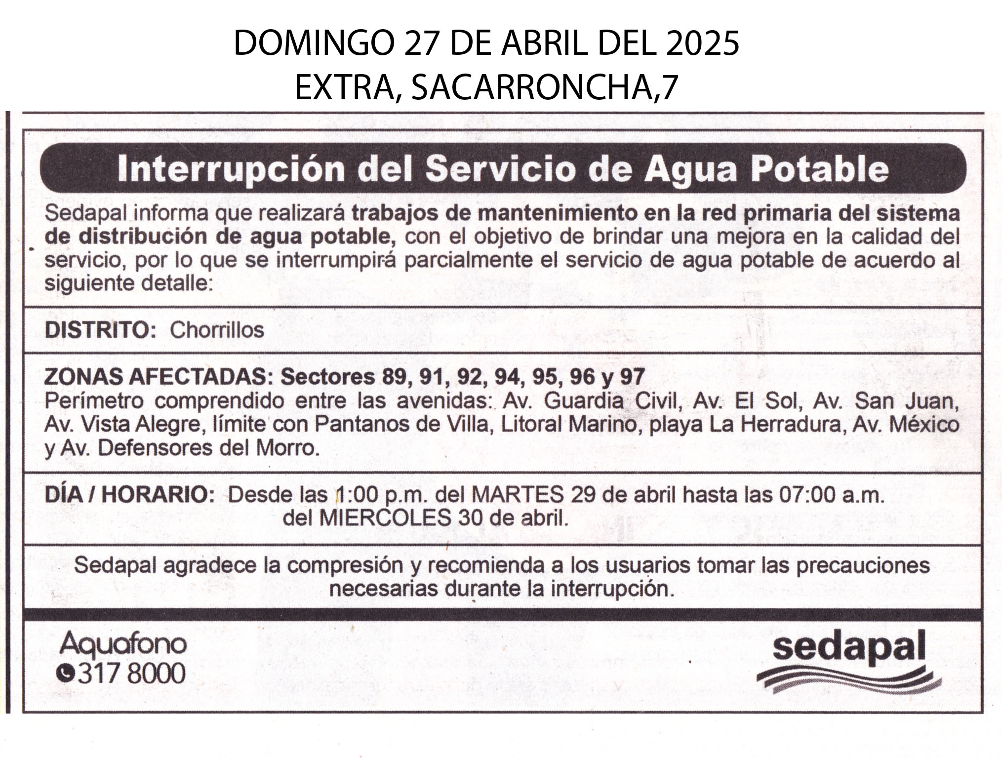 Interrupción del Servicio de Agua Potable Sedapal informa que realizará trabajos de mantenimiento en la red primaria del sistema de distribución de agua potable, con el objetivo de brindar una mejora en la calidad del servicio, por lo que se interrumpirá parcialmente el servicio de agua potable de acuerdo al siguiente detalle: DISTRITO: Chorrillos ZONAS AFECTADAS: Sectores 89, 91, 92, 94, 95, 96 y 97 Perímetro comprendido entre las avenidas: Av. Guardia Civil, Av. El Sol, Av. San Juan, Av. Vista Alegre, límite con Pantanos de Villa, Litoral Marino, playa La Herradura, Av. México y Av. Defensores del Morro. DÍA! HORARIO: Desde las 1:00 p.m. del MARTES 29 de abril hasta las 07:00 am. del MIERCOLES 30 de abril. Sedapal agradece la compresión y recomienda a los usuarios tomar las precauciones necesarias durante la interrupción.