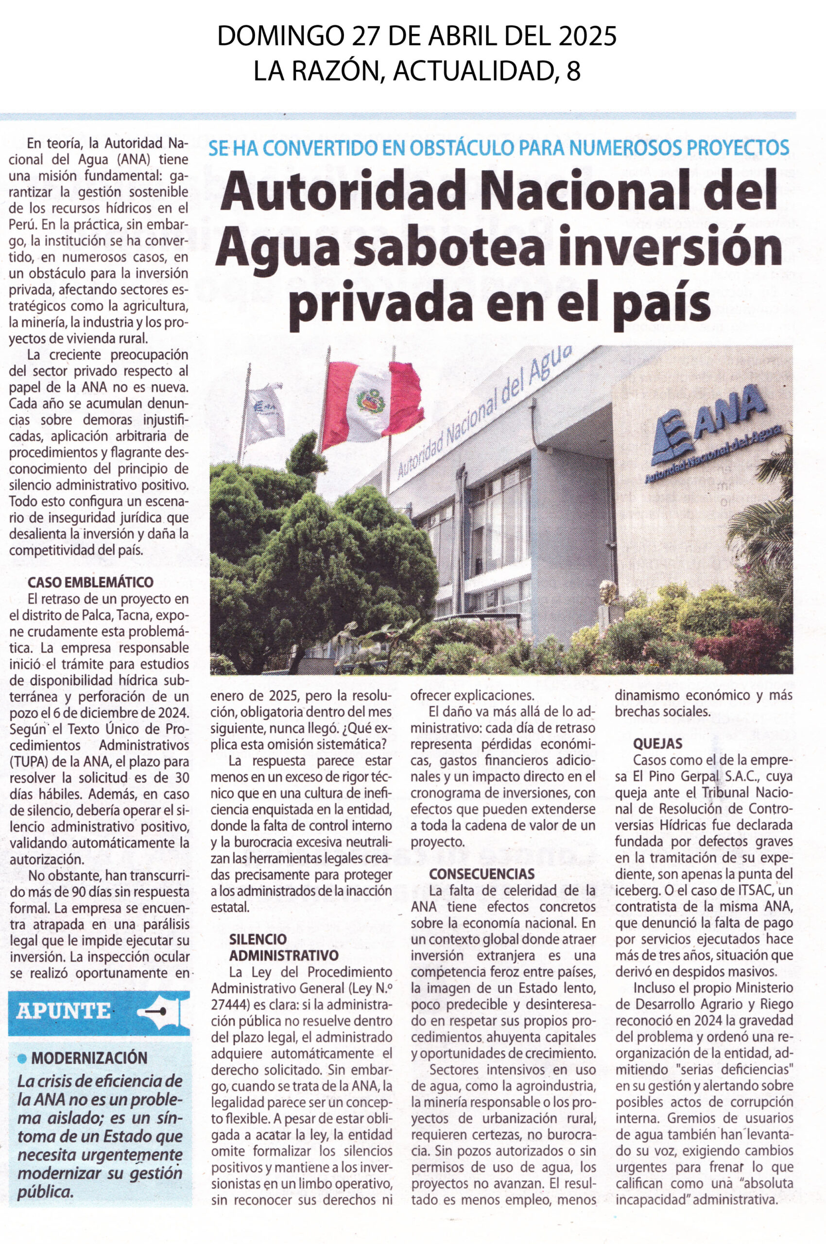 Autoridad Nacional del agua sabotea inversión privada en el país En teoría, la Autoridad Nacional del Agua (ANA) tiene una misión fundamental: garantizar la gestión sostenible de los recursos hídricos en el Perú. En la práctica, sin embargo, la institución se ha convertido, en numerosos casos, en un obstáculo para la inversión privada, afectando sectores estratégicos como la agricultura, la minería, la industria y los proyectos de vivienda rural. La creciente preocupación del sector privado respecto al papel de la ANA no es nueva. Cada año se acumulan denuncias sobre demoras injustificadas, aplicación arbitraria de procedimientos y flagrante desconocimiento del principio de silencio administrativo positivo. Todo esto configura un escenario de inseguridad jurídica que desalienta la inversión y daña la competitividad del país.