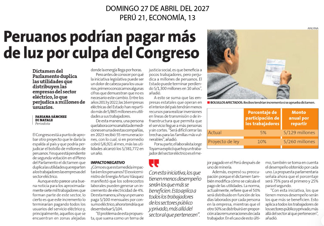 Peruanos podrían pagar más de luz por culpa del Congreso El Congreso está a punto de aprobar otro proyecto que le daría la espalda al país y que podría perjudicar el bolsillo de millones de peruanos. Y que está pendiente de segunda votación en el Pleno del Parlamento el dictamen que duplica las utilidades que reparten a los trabajadores las empresas del sector eléctrico. Aunque esto parece una buena noticia para los aproximadamente siete mil trabajadores que forman parte de este sector, lo cierto es que este incremento lo terminarían pagando todos los usuarios del servicio eléctrico y, principalmente, aquellos que se encuentran en zonas alejadas donde la energía llega por horas.