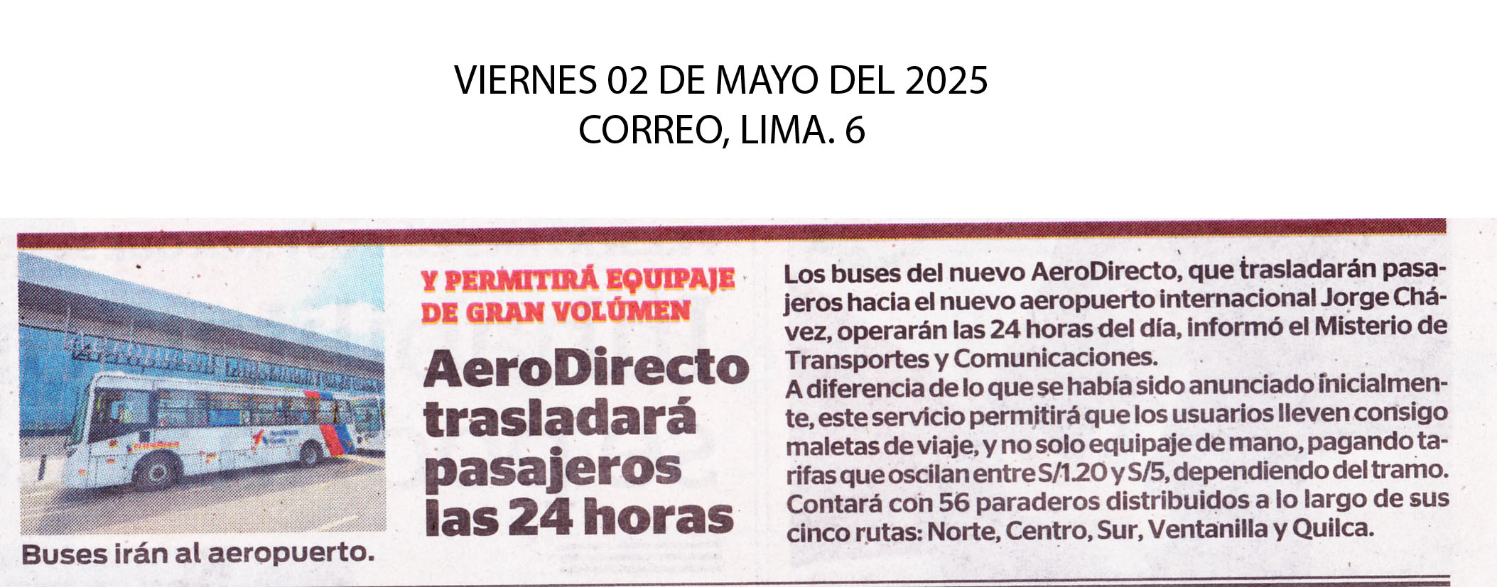 Los buses del nuevo AeroDirecto, que trasladarán pasajeros hacia el nuevo aeropuerto internacional Jorge Chávez, operarán las 24 horas del día, informó el Ministrio de Transportes y Comunicaciones. A diferencia de lo que se había anunciado inicialmente, este servicio permitirá que los usuarios lleven consigo maletas de viaje, y no solo equipaje de mano, pagando tarifas que oscilan entre S/ 1.20 y S/ 5, dependiendo del tramo.