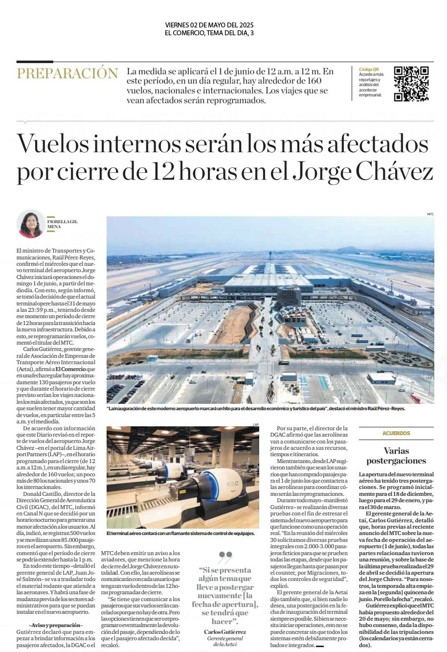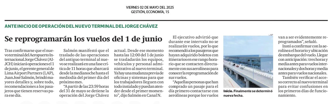 Tras confirmarse que el nuevo terminal del Aeropuerto Internacional Jorge Chávez (AIJCH) iniciará operaciones el 1 de junio, el gerente general de Lima Airport Partners (LAP), Juan José Salmón, brindó mayores detalles y recomendaciones a los pasajeros que tienen reservas para ese día. Salmón manifestó que el traslado de las operaciones del antiguo terminal al nuevo se realizará en una fase crítica de 11 horas que abarcará desde la medianoche hasta el mediodía del primer día del mes. “A partir de las 23:59 horas del 31 de mayo se detiene la operación del Jorge Chávez actual. Desde ese momento hasta las 12:00 del 1 de junio se trasladarán los equipos, vehículos y personal administrativo al nuevo terminal. Ya hay una mudanza previa de oficinas y sistemas para que los trabajadores lleguen con todo instalado y puedan atender desde el primer momento”, indicó Salmón en Canal N.