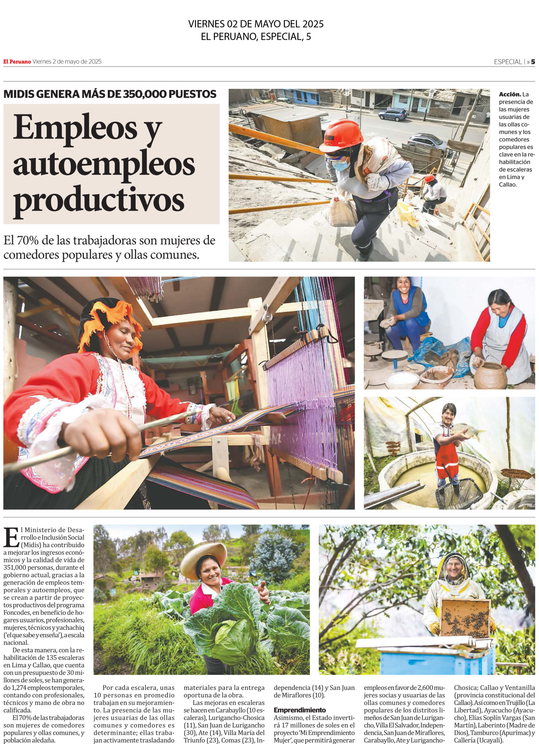 El Ministerio de Desarrollo e Inclusión Social (Midis) ha contribuido a mejorar los ingresos económicos y la calidad de vida de 351,000 personas, durante el gobierno actual, gracias a la generación de empleos temporales y autoempleos, que se crean a partir de proyectos productivos del programa Foncodes, en beneficio de hogares usuarios, profesionales, mujeres, técnicos y yachachiq (‘el que sabe y enseña’), a escala nacional. De esta manera, con la rehabilitación de 135 escaleras en Lima y Callao, que cuenta con un presupuesto de 30 millones de soles, se han generado 1,274 empleos temporales, contando con profesionales, técnicos y mano de obra no calificada.