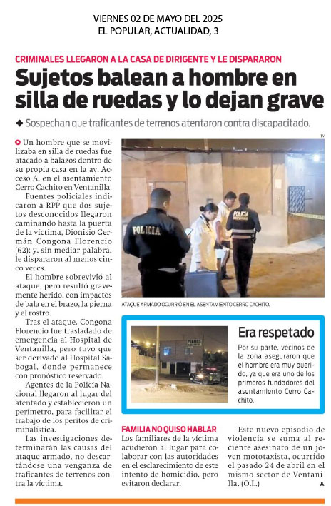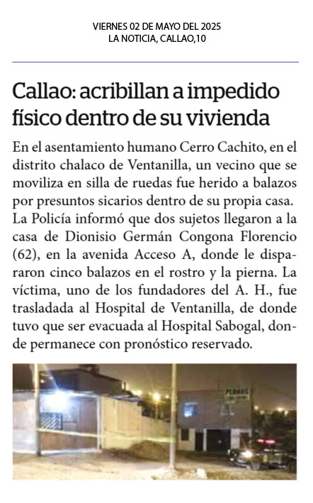 En el asentamiento humano Cerro Cachito, en el distrito chalaco de Ventanilla, un vecino que se moviliza en silla de ruedas fue herido a balazos por presuntos sicarios dentro de su propia casa. La Policía informó que dos sujetos llegaron a la casa de Dionisio Germán Congona Florencio (62), en la avenida Acceso A, donde le dispararon cinco balazos en el rostro y la pierna. La víctima, uno de los fundadores del A. H., fue trasladada al Hospital de Ventanilla, de donde tuvo que ser evacuada al Hospital Sabogal, donde permanece con pronóstico reservado.
