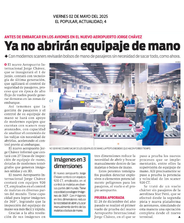 El nuevo aeropuerto internacional Jorge Chávez, que se inaugurará el domingo 1 de junio, contará con escáneres de última tecnología para analizar el contenido de las maletas, informó el operador del terminal. Se trata de equipos 920 CT, que generan imágenes en 360 grados, logrando que la inspección sea más profunda y en menor tiempo.