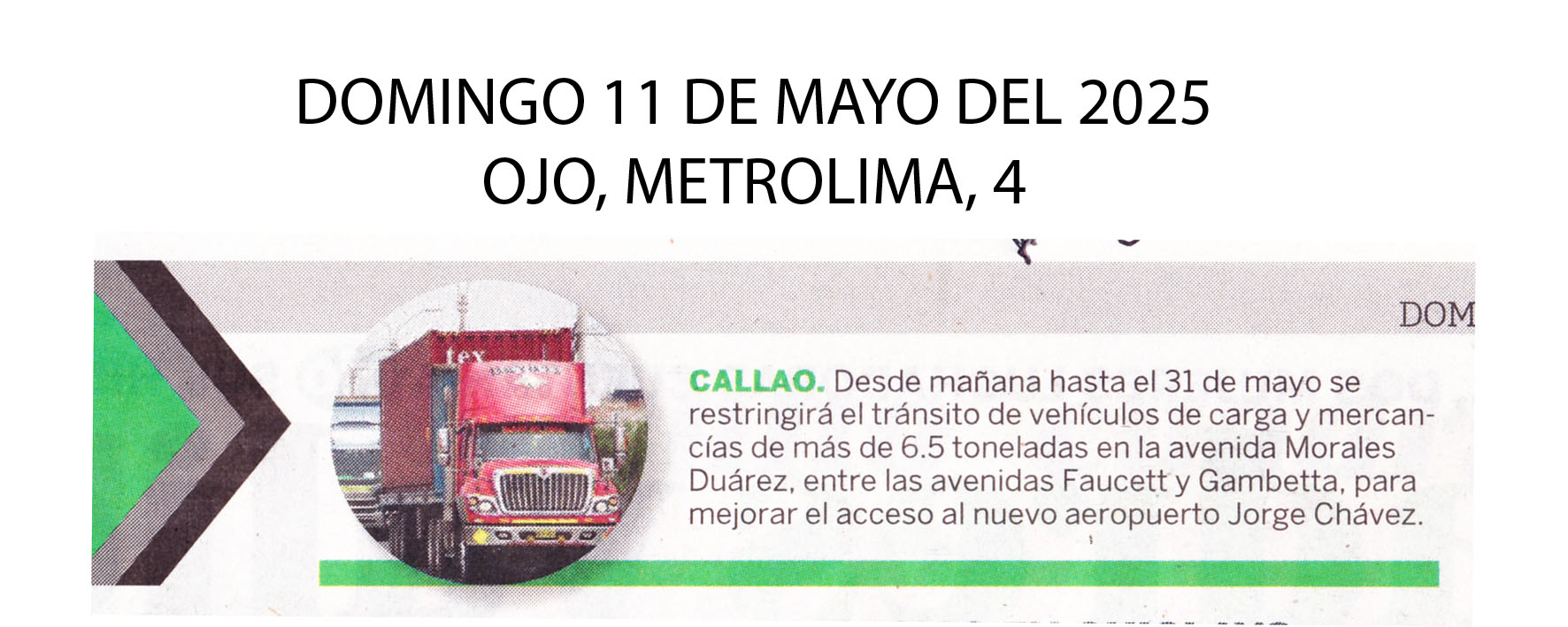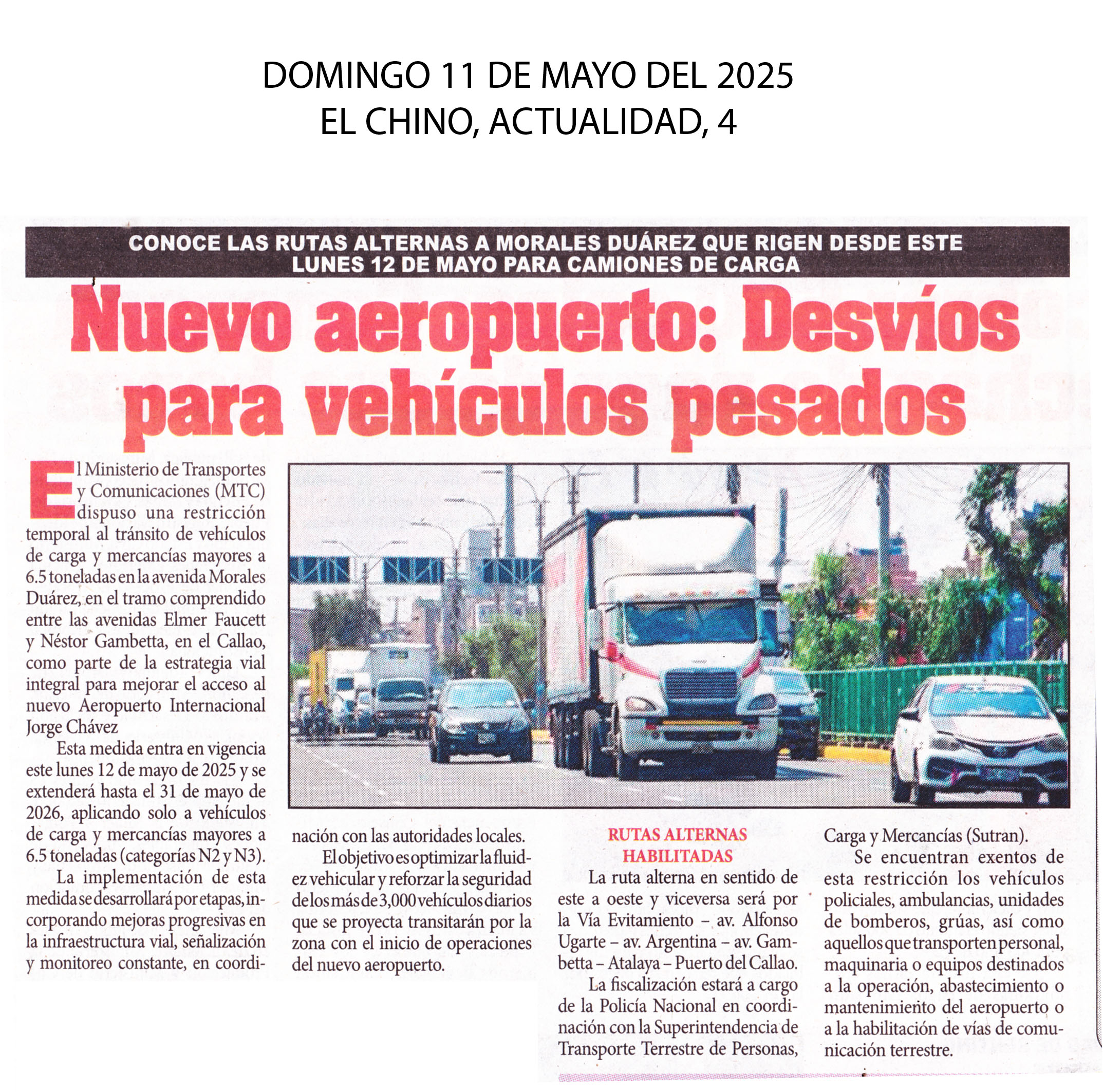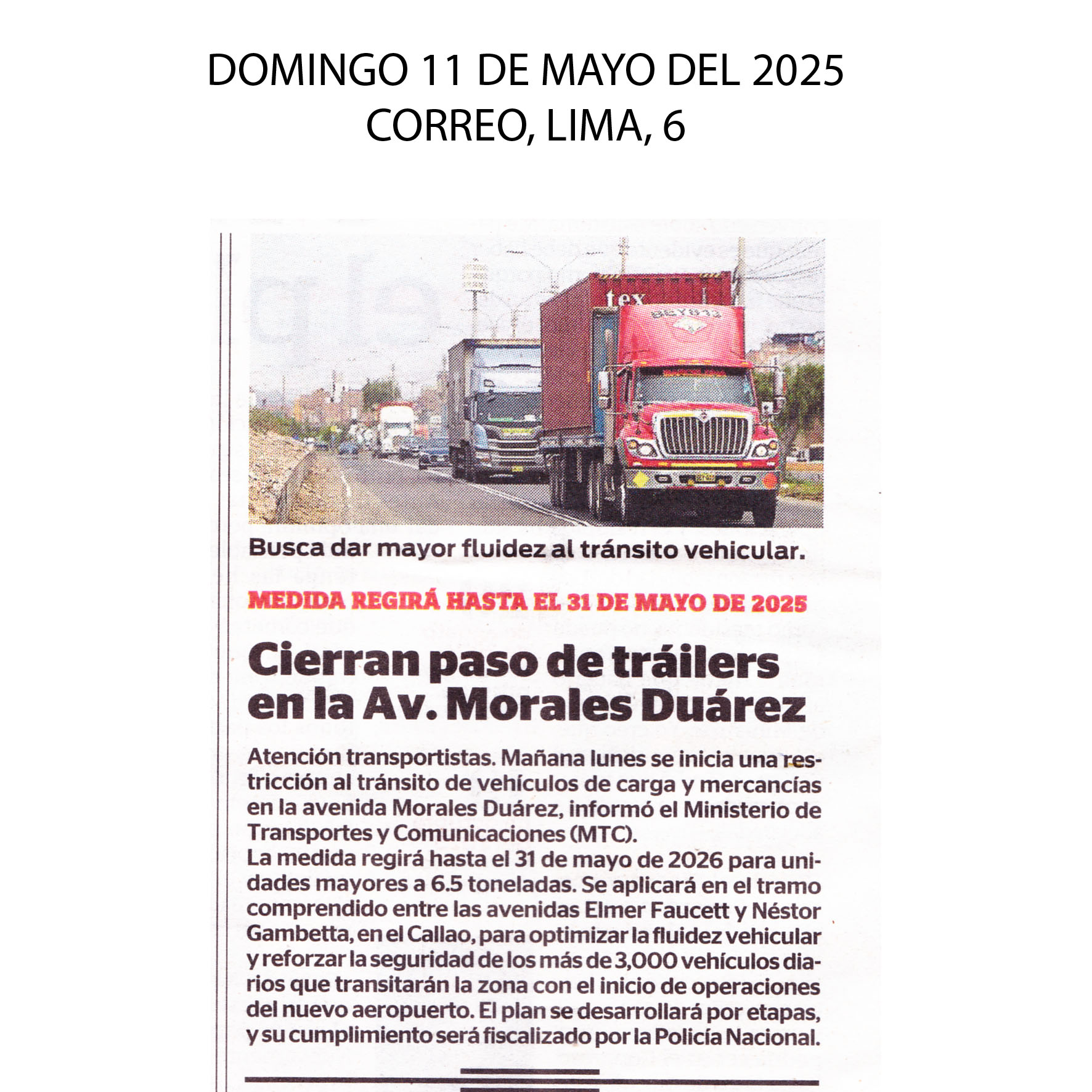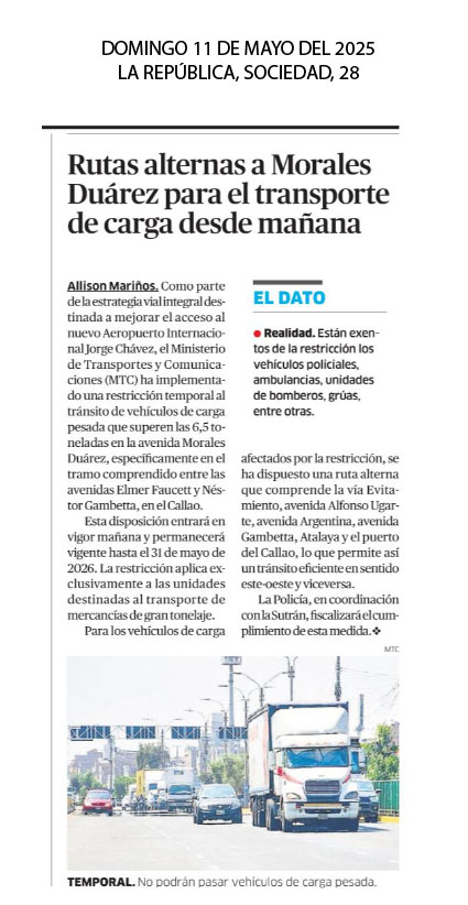 Como parte de la estrategia vial integral destinanada a mejorar el acceso al nuevo Aeropuerto Internacional Jorge Chávez, el Ministerio de Transporte y Comunicaciones (MTC) ha implementado una restricción temporal al tránsito de vehículos de carga pesada que superen las 6,5 toneladas en la avenida Morales Duárez, específicamente en el tramo comprendido entre las avenidas Elmer Faucett y Néstor Gambetta, en el Callao. Esta disposición entre en vigor mañana y permanecerá vigente hasta el 31 de mayo de 2026.
