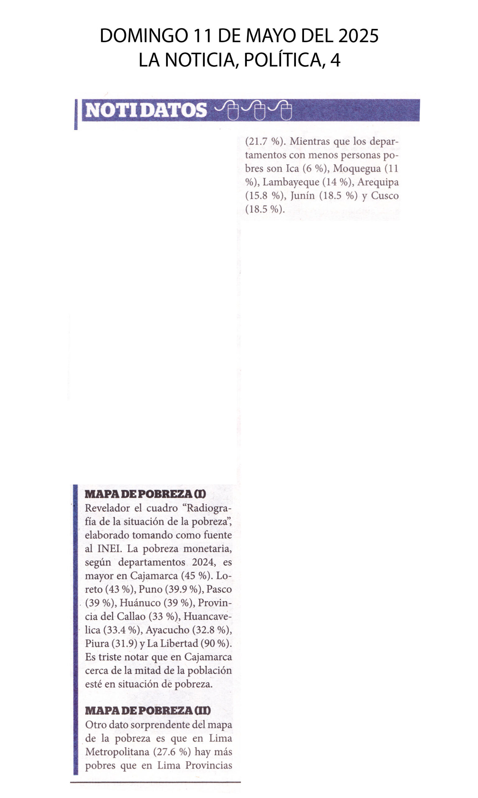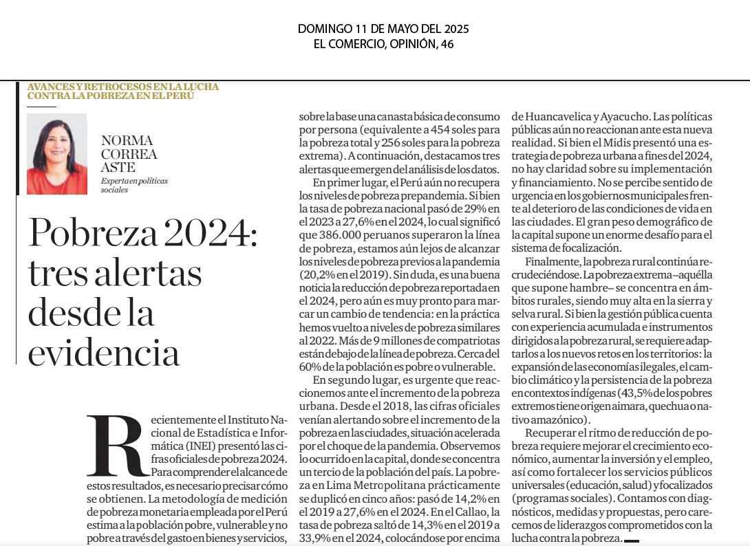 Artículo de Norma Correa Aste (Experta en políticas sociales). "(...) La pobreza en Lima Metropolitana prácticamente se duplicó en cinco años: pasó de 14,2% en el 2019 a 27,6% en el 2024. En el Callao, la tasa de pobreza saltó de 14,3% en el 2019 a 33,9% en el 2024, colocándose por encima de Huancavelica y Ayacucho. Las políticas públicas aún no reaccionan ante esta nueva realidad...".