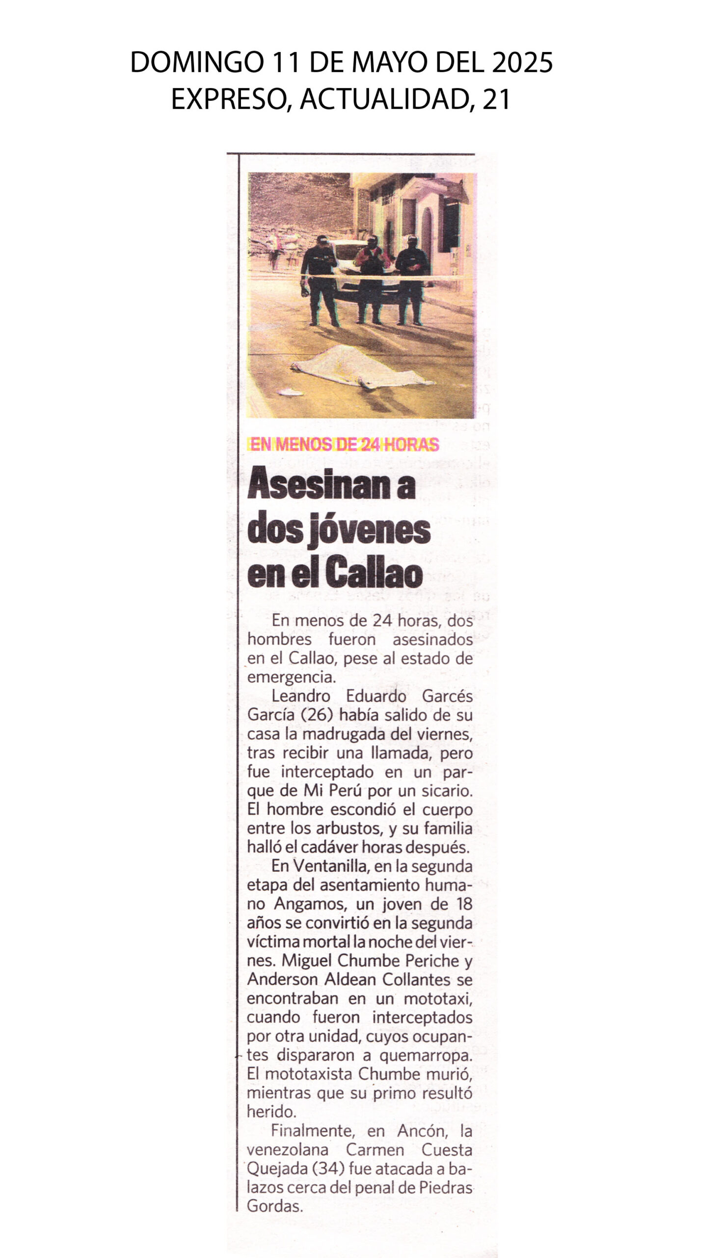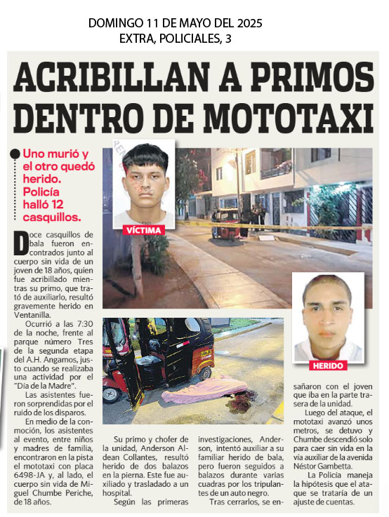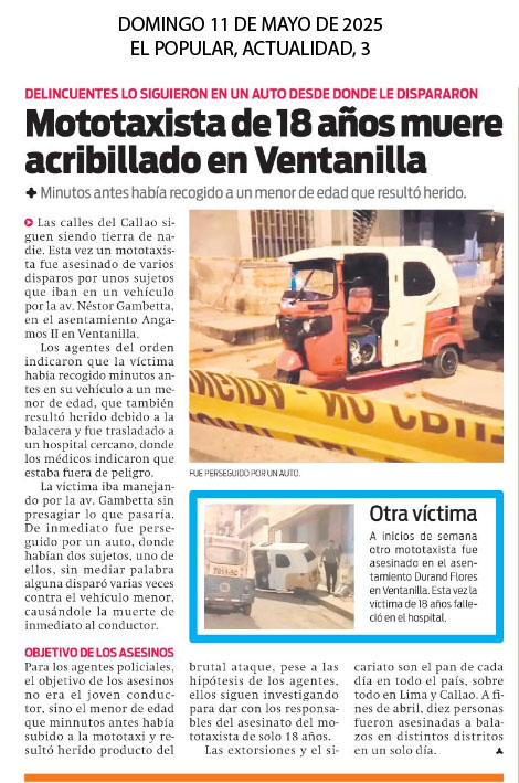 Las calles del Callao siguen siendo tierra de nadie. Esta vez un mototaxista de nombre Miguel Chumbe periche, fue asesinado de varios disparos por unos sujetos que iban en un vehículo por la av. Néstor Gambetta. en el asentamiento Angamos II en Ventanilla. Los agentes del orden indicaron que la víctima había recogido minutos antes en su vehículo a un menor de edad, que también resultó herido debido a la balacera y fue trasladado a un hospital cercano. donde los médicos indicaron que estaba fuera de peligro. Mientras que, Leandro Garcés García (26) fue interceptado en parque de Mi Perú por un sicario y asesinado.