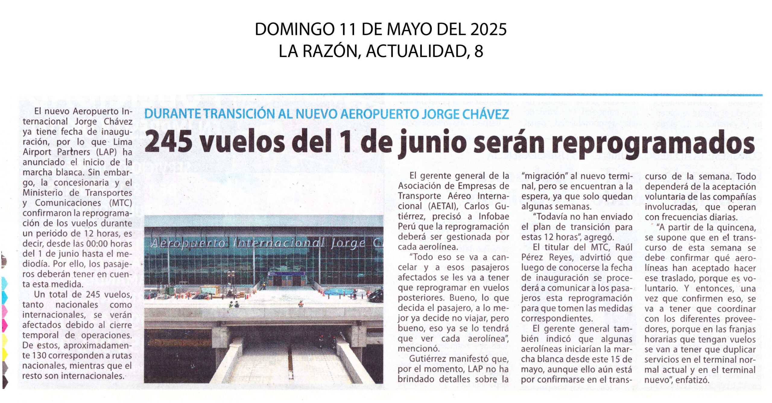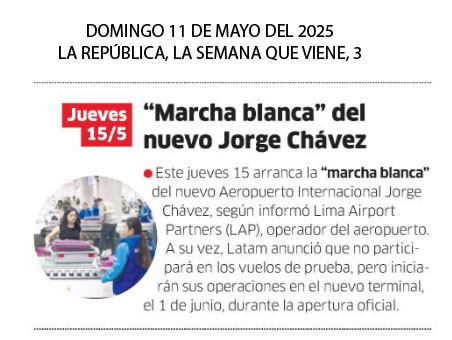 Este jueves 15 arranca la “marcha blanca” del nuevo Aeropuerto Internacional Jorge Chávez, según informó Lima Airport Partners (LAP), operador del aeropuerto. A su vez, Latam anunció que no participará en los vuelos de prueba, pero inciarán sus operaciones en el nuevo terminal, el 1 de junio, durante la apertura oficial.