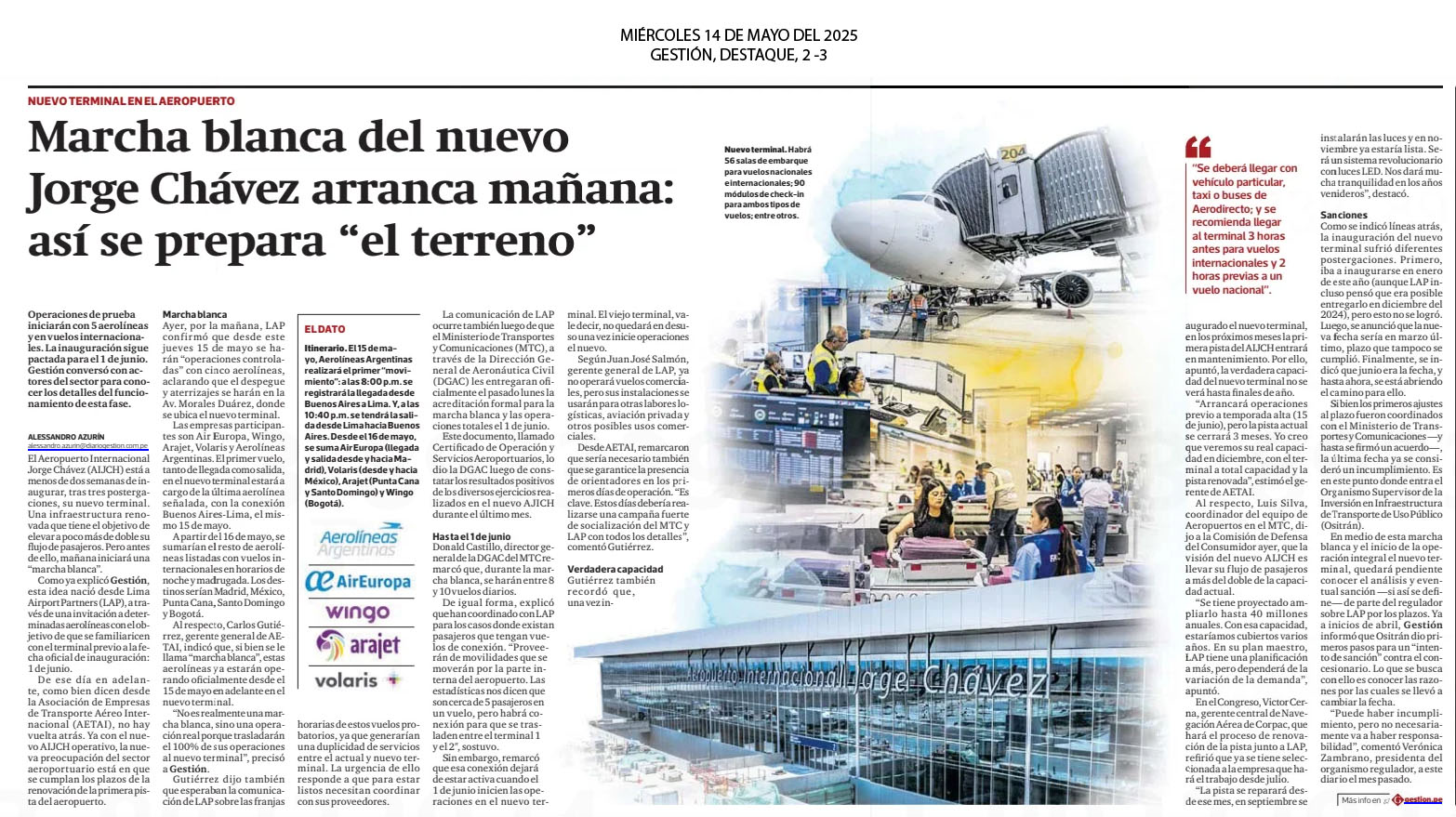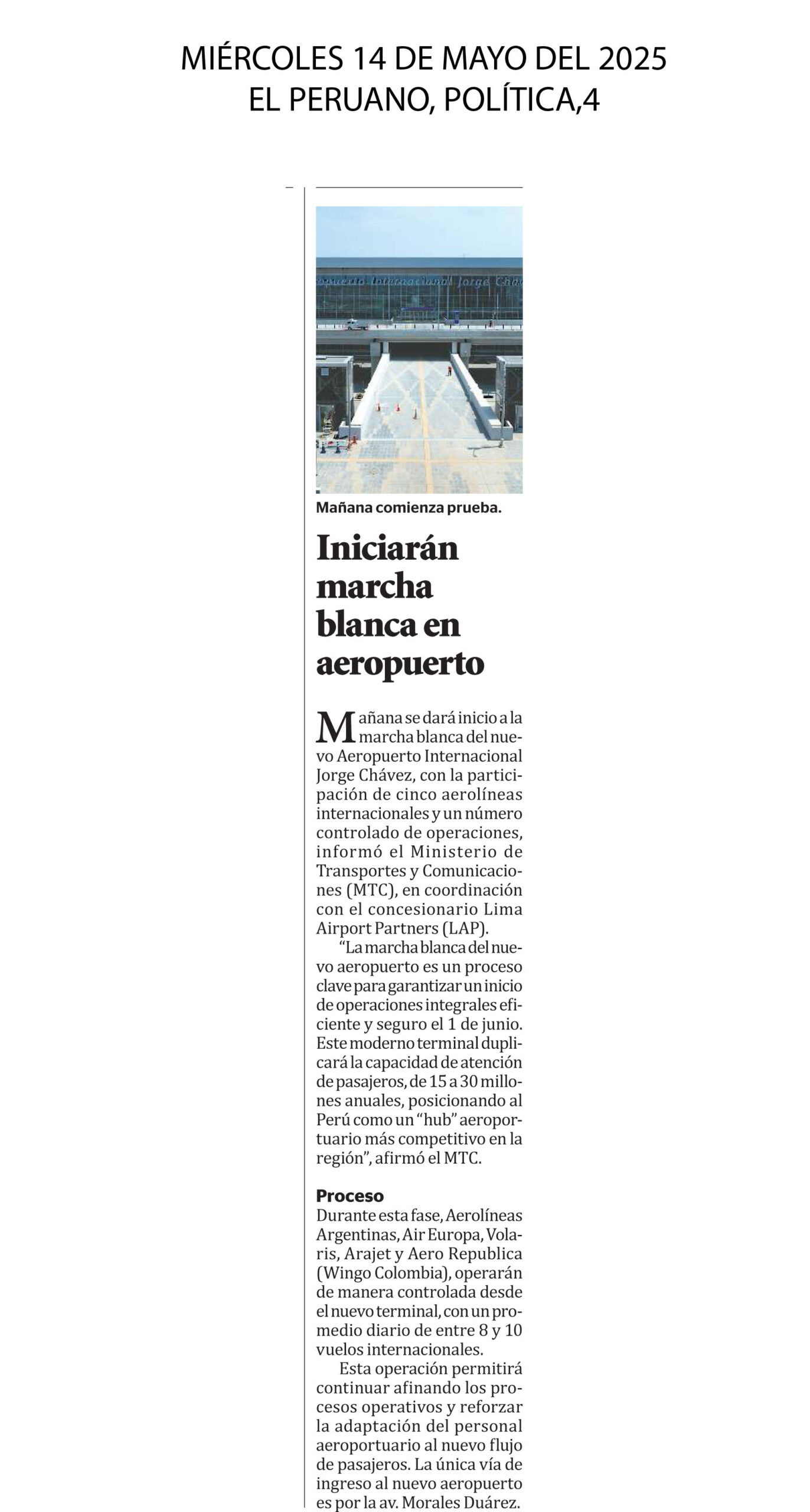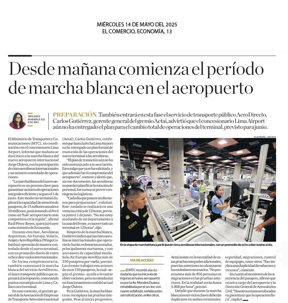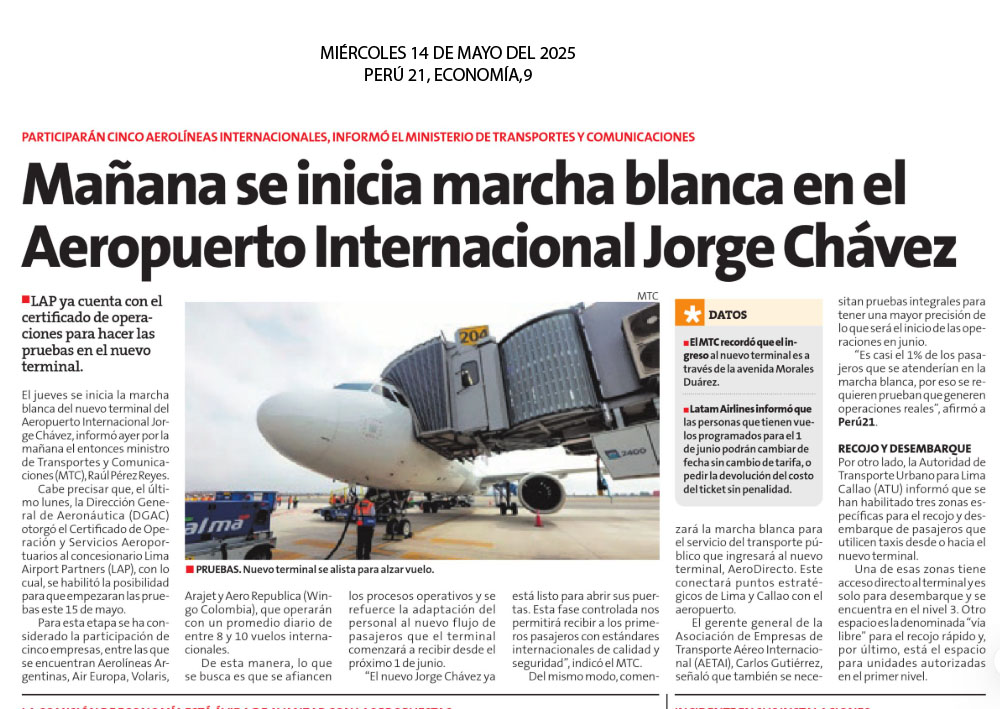 Mañana se dará inicio a la marcha blanca del nuevo Aeropuerto Internacional Jorge Chávez, con la participación de cinco aerolíneas internacionales y un número controlado de operaciones, informó el Ministerio de Transportes y Comunicaciones (MTC), en coordinación con el concesionario Lima Airport Partners (LAP). “La marcha blanca del nuevo aeropuerto es un proceso clave para garantizar un inicio de operaciones integrales eficiente y seguro el 1 de junio. Este moderno terminal duplicará la capacidad de atención de pasajeros, de 15 a 30 millones anuales, posicionando al Perú como un “hub” aeroportuario más competitivo en la región”, afirmó el MTC.