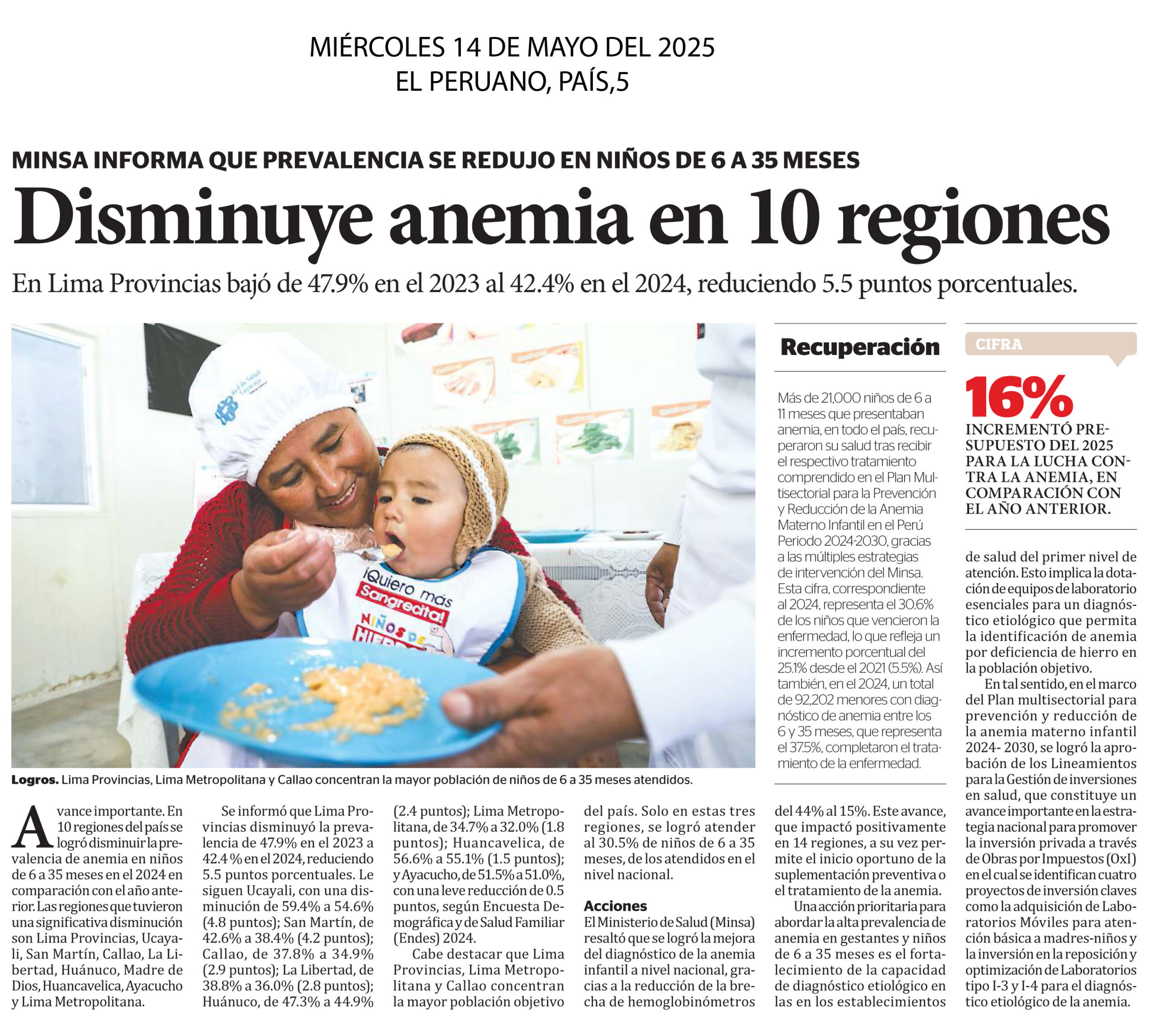 Avance importante. En 10 regiones del país se logró disminuir la prevalencia de anemia en niños de 6 a 35 meses en el 2024 en comparación con el año anterior. Las regiones que tuvieron una significativa disminución son Lima Provincias, Ucayali, San Martín, Callao, La Libertad, Huánuco, Madre de Dios, Huancavelica, Ayacucho y Lima Metropolitana. Se informó que Lima Provincias disminuyó la prevalencia de 47.9% en el 2023 a 42.4 % en el 2024, reduciendo 5.5 puntos porcentuales. En el Callao, la reducción fue de 37.8% a 34.9% (2.9 puntos). Cabe destacar que Lima Provincias, Lima Metropolitana y Callao concentran la mayor población objetivo del país. Solo en estas tres regiones, se logró atender al 30.5% de niños de 6 a 35 meses, de los atendidos en el nivel nacional.