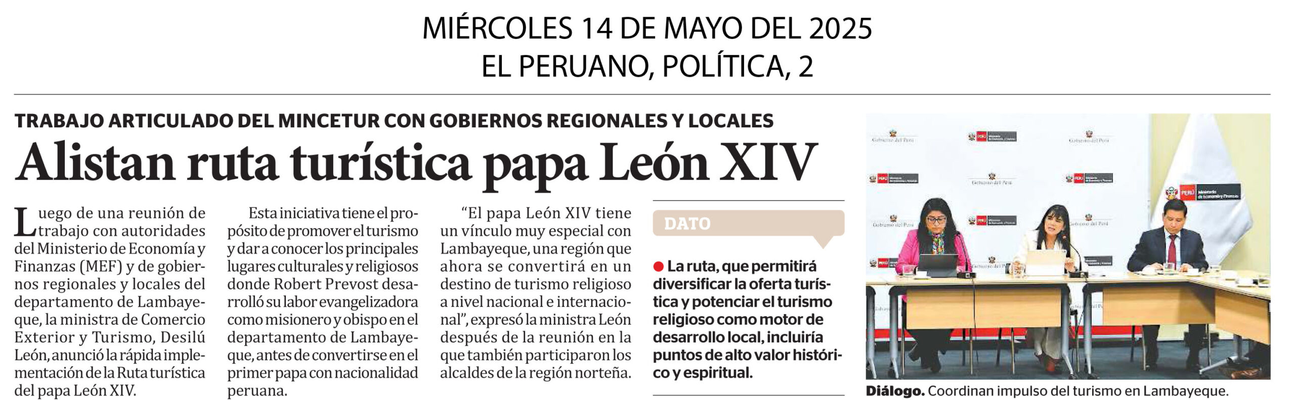 Luego de una reunión de trabajo con autoridades del Ministerio de Economía y Finanzas (MEF) y de gobiernos regionales y locales del departamento de Lambayeque, la ministra de Comercio Exterior y Turismo, Desilú León, anunció la rápida implementación de la Ruta turística del papa León XIV. “El papa León XIV tiene un vínculo muy especial con Lambayeque, una región que ahora se convertirá en un destino de turismo religioso a nivel nacional e internacional”, expresó la ministra León después de la reunión en la que también participaron los alcaldes de la región norteña.