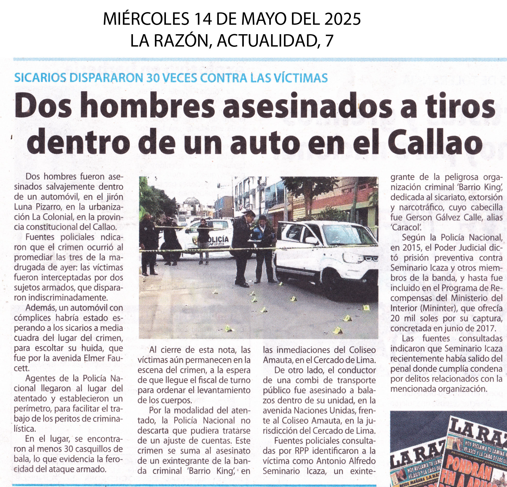 Dos hombres fueron asesinados salvajemente dentro de un automóvil, en el jirón Luna Pizarro, en la urbanización La Colonial, en la provincia constitucional del Callao. Fuentes policiales consultadas indicaron que el crimen ocurrió al promediar las tres de la madrugada de este martes: las víctimas fueron interceptadas por dos sujetos armados, que dispararon indiscriminadamente. Además, un automóvil con cómplices habría estado esperando a los sicarios a media cuadra del lugar del crimen, para escoltar su huida, que fue por la avenida Elmer Faucett. Fuentes policiales consultadas identificaron a la víctima como Antonio Alfredo Seminario Icaza, un exintegrante de la peligrosa organización criminal ‘Barrio King’, dedicada al sicariato, extorsión y narcotráfico, cuyo cabecilla fue Gerson Gálvez Calle, alias ‘Caracol’.
