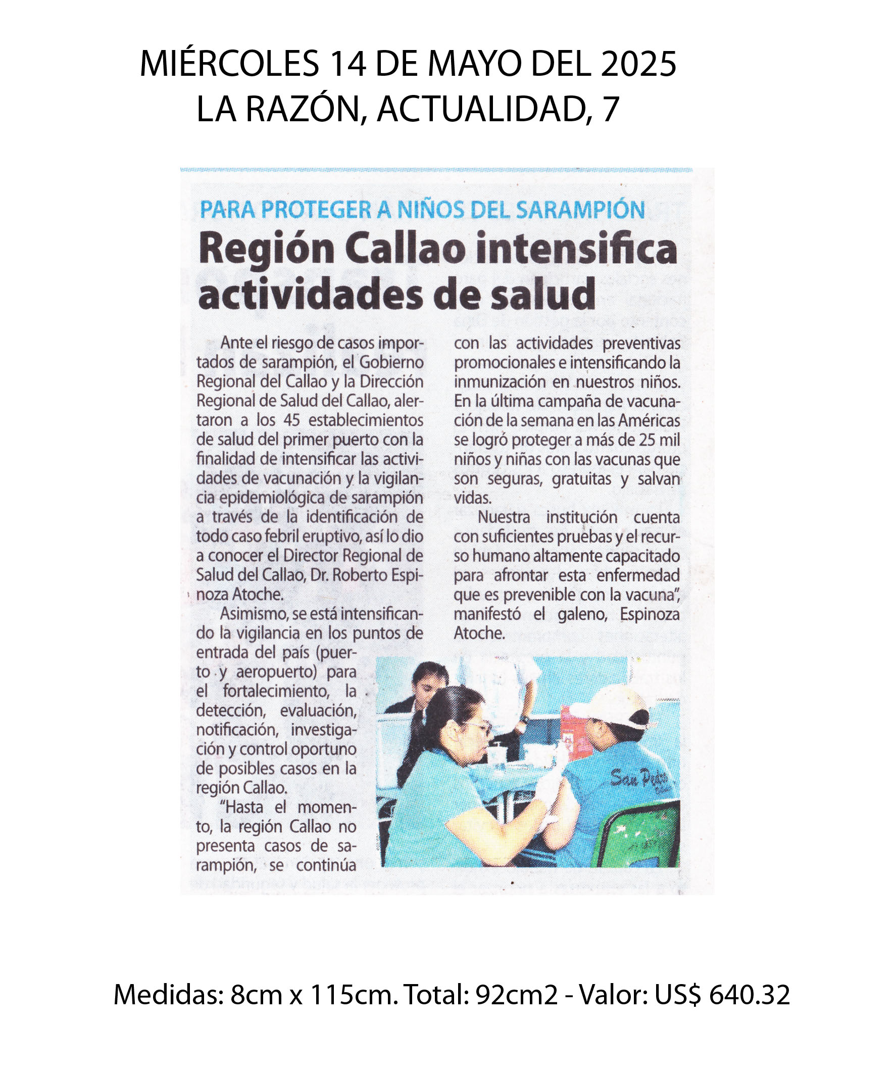 Ante el riesgo de casos importados de sarampión, el Gobierno Regional del Callao y la Dirección Regional de Salud del Callao, alertaron a los 45 establecimientos de salud del primer puerto con la finalidad de intensificar las actividades de vacunación y la vigilancia epidemiológica de sarampión a través de la identificación de todo caso febril eruptivo, así lo dio a conocer el Director Regional de Salud del Callao, Dr. Roberto Espinoza Atoche. Asimismo, se está intensificando la vigilancia en los puntos de entrada del país (puerto y aeropuerto) para el fortalecimiento, la detección, evaluación, notificación, investigación y control oportuno de posibles casos en la región Callao.