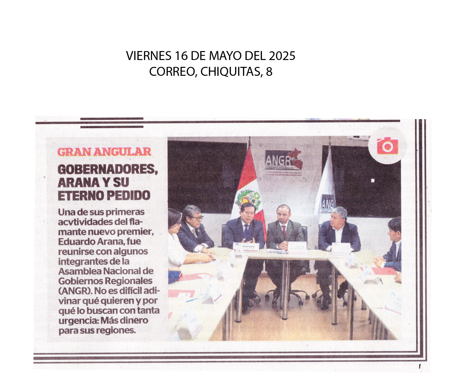 Una de sus primeras activdades del flamante nuevo premier, Eduardo Arana, fue reunirse con algunos integrantes de la Asamblea Nacional de Gobierno Regionales (ANGR). No es difícil adivinar qué quieren y por qué lo buscan con tanta urgencia: Más dinero para sus regiones.