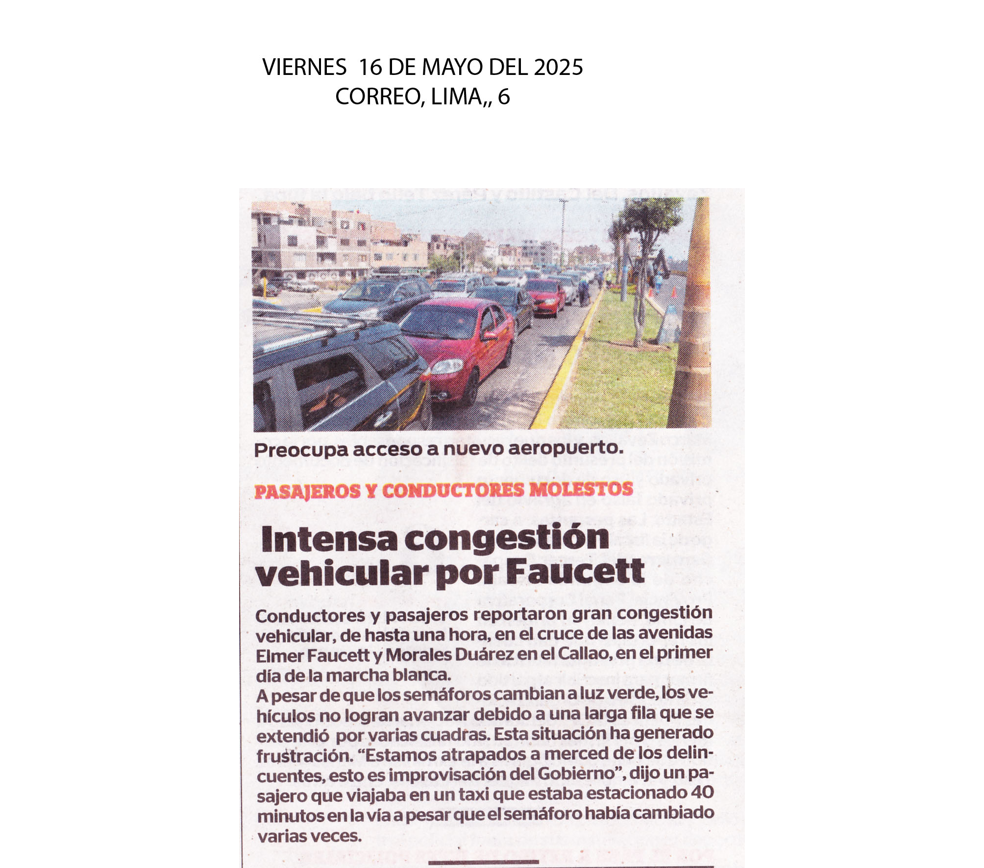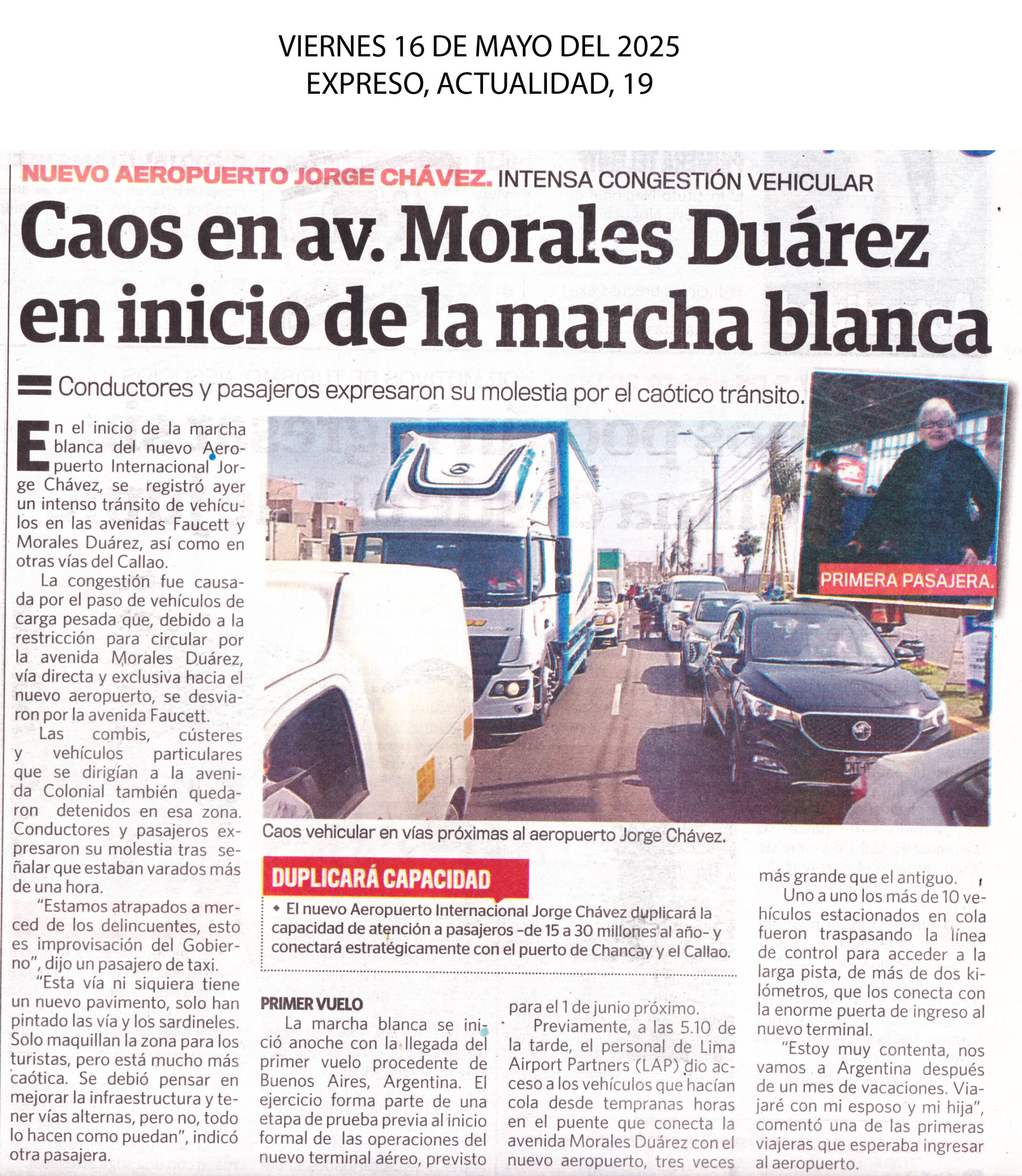 En el inicio de la marcha blanca del nuevo Aeropuerto Internacional Jorge Chávez, se registró ayer un intenso tránsito de vehículos en las avenidas Faucett y Morales Duárez, así como en otras vías del Callao. La congestion fue causada por el paso de vehículos de carga pesada que, debido a la restricción de circular por la avenida Morales Duárez, via directa y exclusive hacia el nuevo aeropuerto, se desviaron por la avenida Faucett.