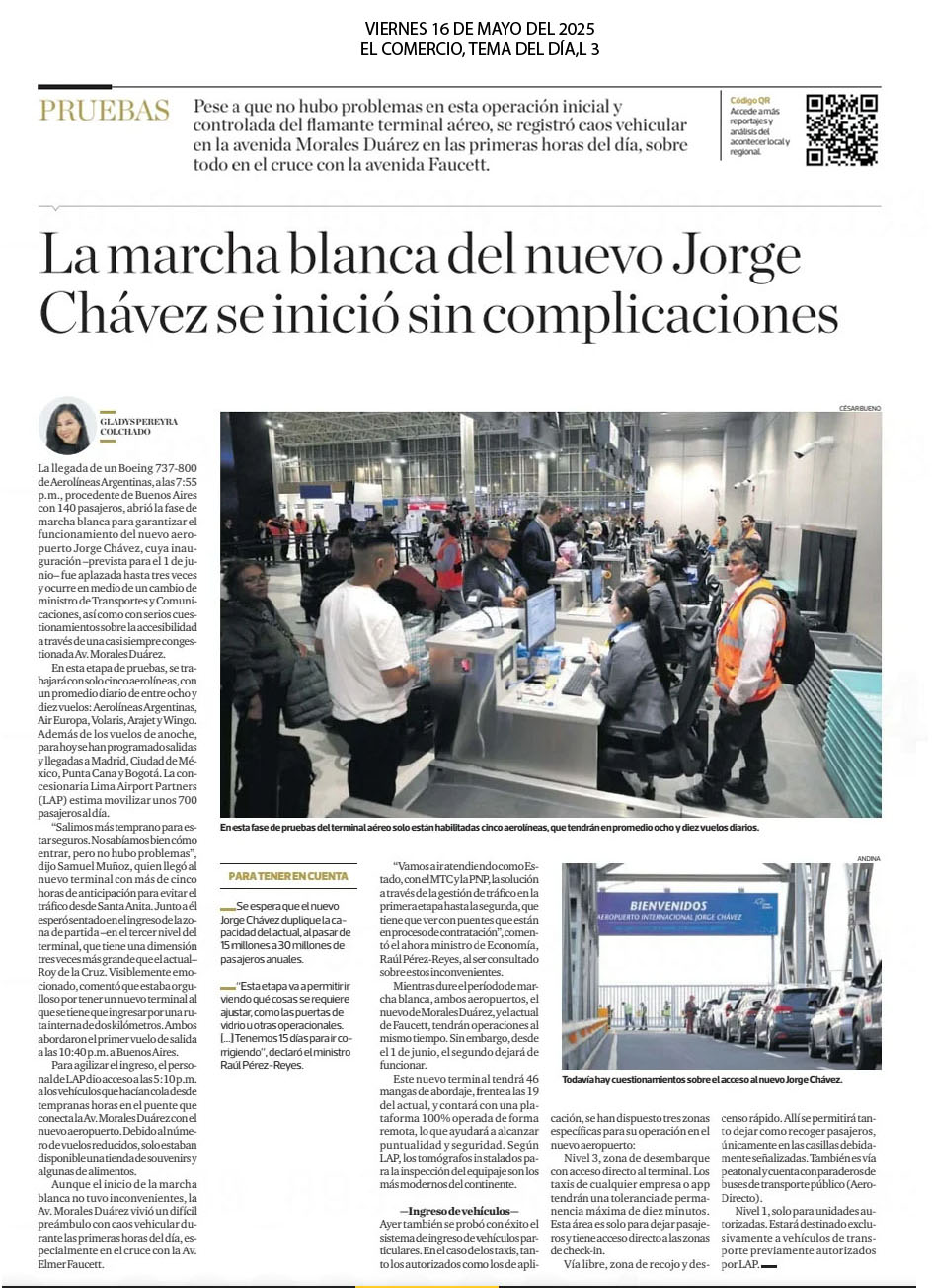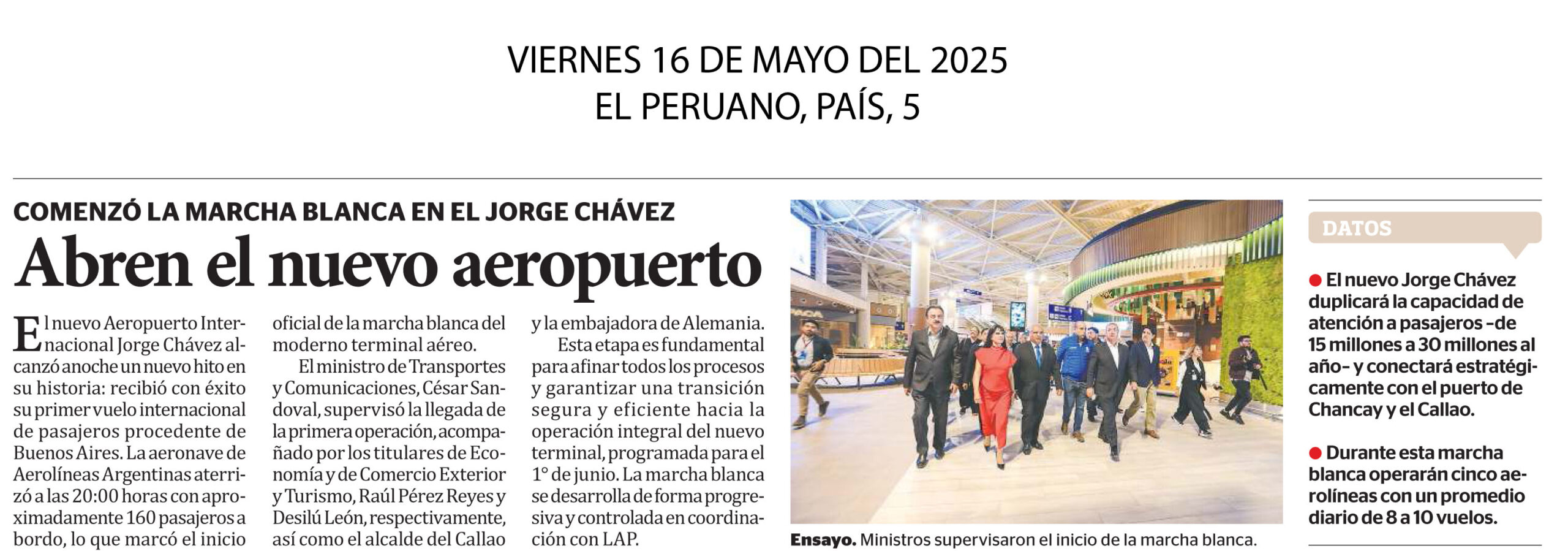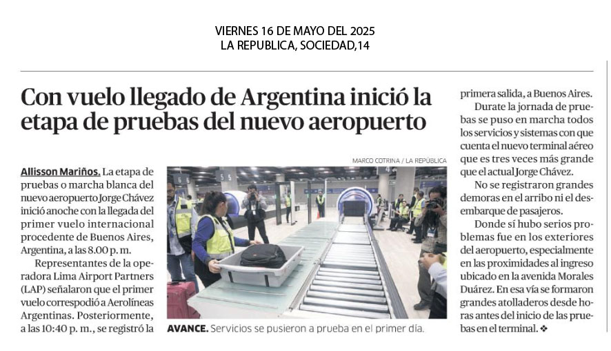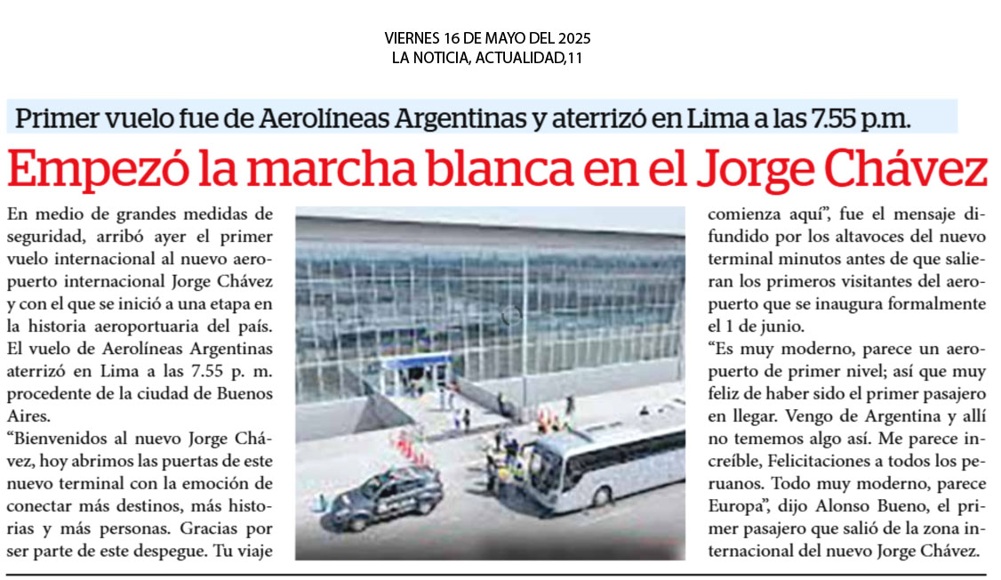 En medio de grandes medidas de seguridad, arribó ayer el primer vuelo internacional al nuevo aeropuerto internacional Jorge Chávez y con el que se inició a una etapa en la historia aeroportuaria del país. El vuelo de Aerolíneas Argentinas aterrizó en Lima a las 7.55 p. m. procedente de la ciudad de Buenos Aires. “Bienvenidos al nuevo Jorge Chávez, hoy abrimos las puertas de este nuevo terminal con la emoción de conectar más destinos, más historias y más personas. “Es muy moderno, parece un aeropuerto de primer nivel; así que muy feliz de haber sido el primer pasajero en llegar. Vengo de Argentina y allí no tememos algo así. Me parece increíble, Felicitaciones a todos los peruanos. Todo muy moderno, parece Europa”, dijo Alonso Bueno, el primer pasajero que salió de la zona internacional del nuevo Jorge Chávez.