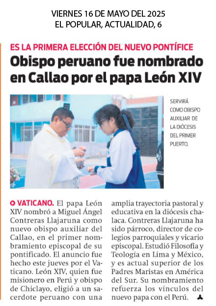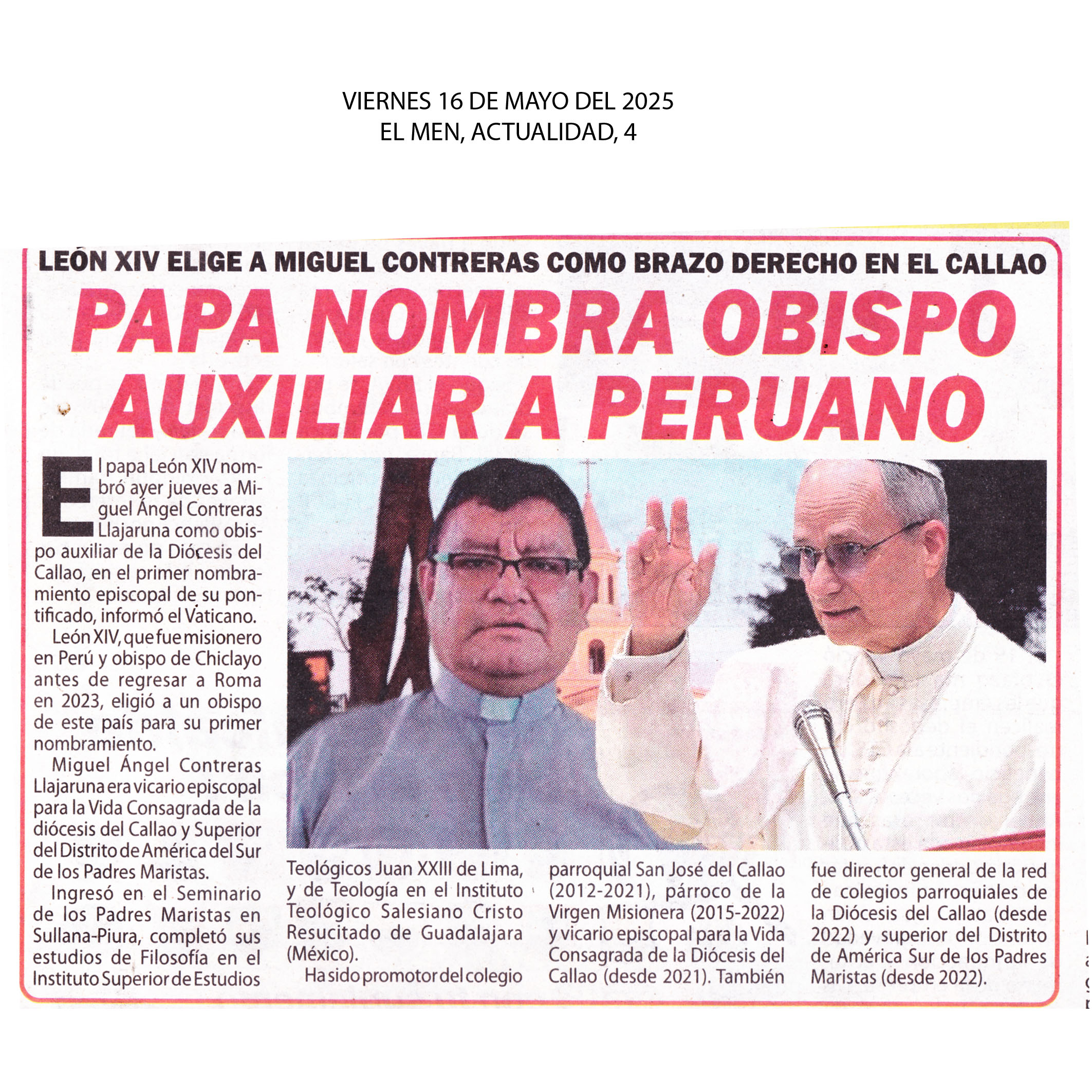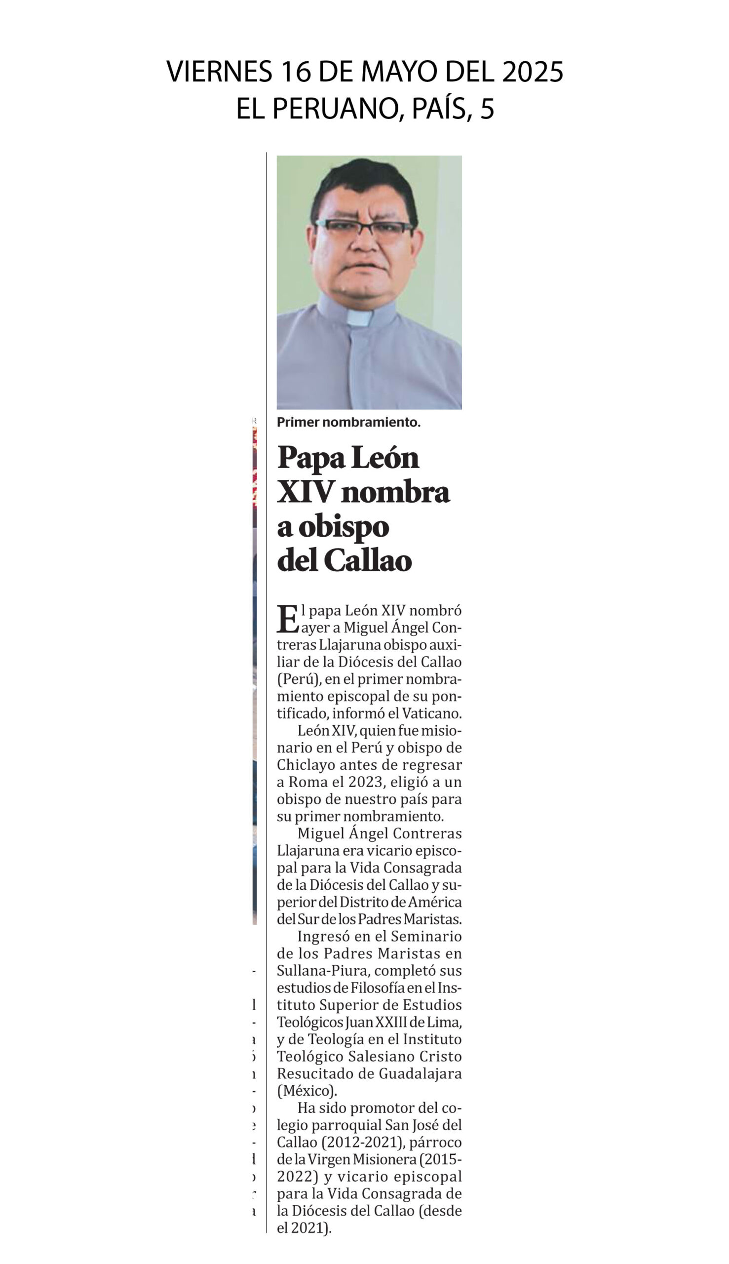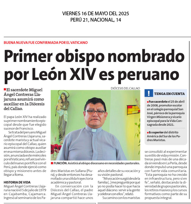 El papa León XIV nombró ayer a Miguel Ángel Contreras Llajaruna obispo auxiliar de la Diócesis del Callao (Perú), en el primer nombramiento episcopal de su pontificado, informó el Vaticano. León XIV, quien fue misionario en el Perú y obispo de Chiclayo antes de regresar a Roma el 2023, eligió a un obispo de nuestro país para su primer nombramiento. Miguel Ángel Contreras Llajaruna era vicario episcopal para la Vida Consagrada de la Diócesis del Callao y superior del Distrito de América del Sur de los Padres Maristas. Ingresó en el Seminario de los Padres Maristas en Sullana-Piura, completó sus estudios de Filosofía en el Instituto Superior de Estudios Teológicos Juan XXIII de Lima, y de Teología en el Instituto Teológico Salesiano Cristo Resucitado de Guadalajara (México).