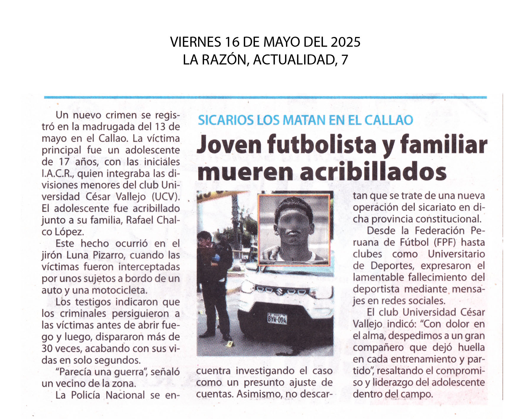 Un nuevo crimen se registró en la madrugada del 13 de mayo en el Callao. La víctima principal fue un adolescente de 17 años, con las iniciales I.A.C.R., quien integraba las divisiones menores del club Universidad César Vallejo (UCV). El adolescente fue acribillado junto a su familiar, Rafael Chalco López. Este hecho ocurrió en el jirón Luna Pizarro.