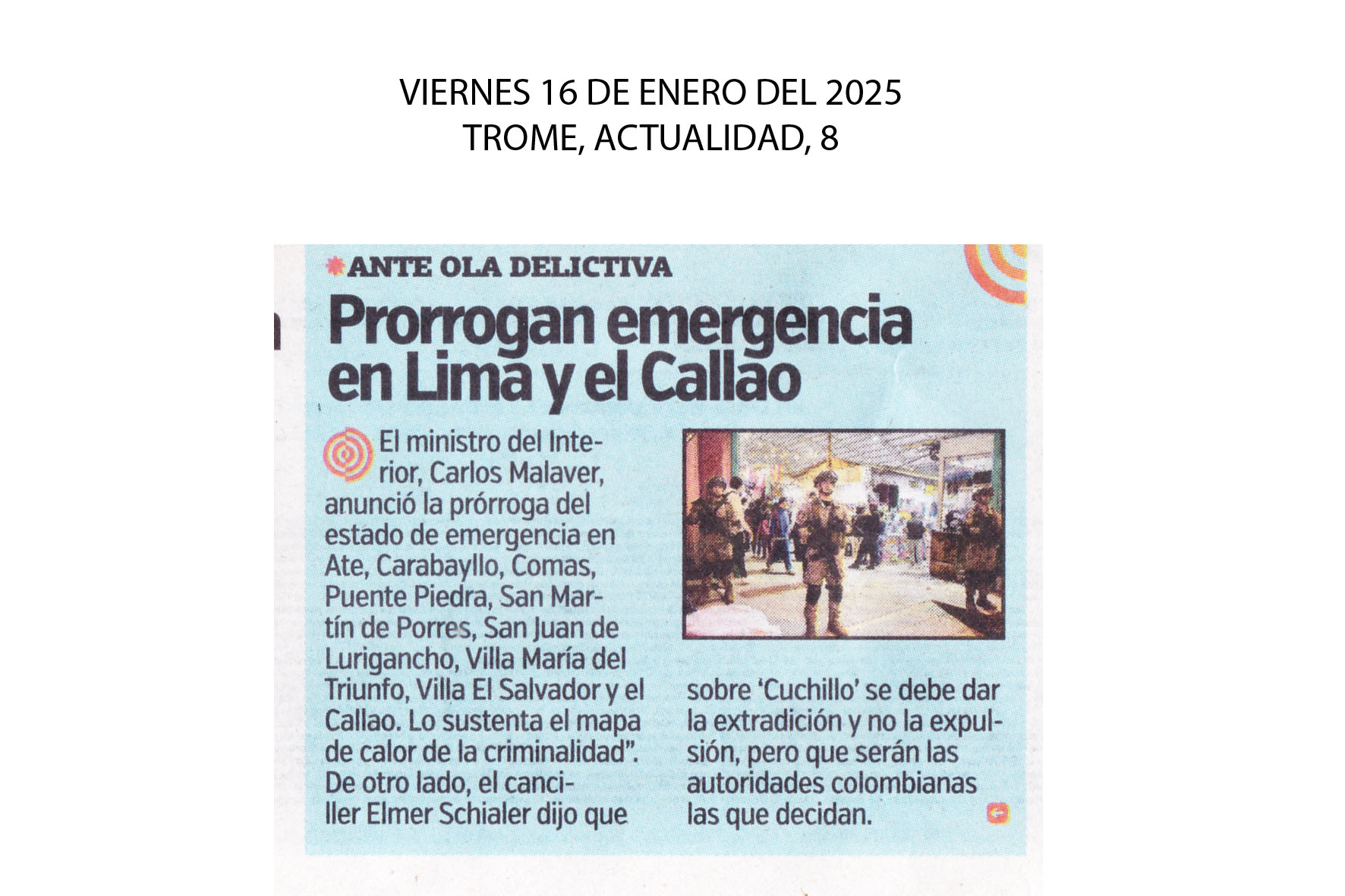 El ministro del Interior, Carlos Malaver, anunció la prórroga del estado de emergencia en Ate, Carabayllo, Comas, Puente Piedra, San Martín de Porres, San Juan de Lurigancho, Villa María del Triunfo, Villa El Salvador y el Callao. Lo sustenta el mapa de calor de la criminalidad.
