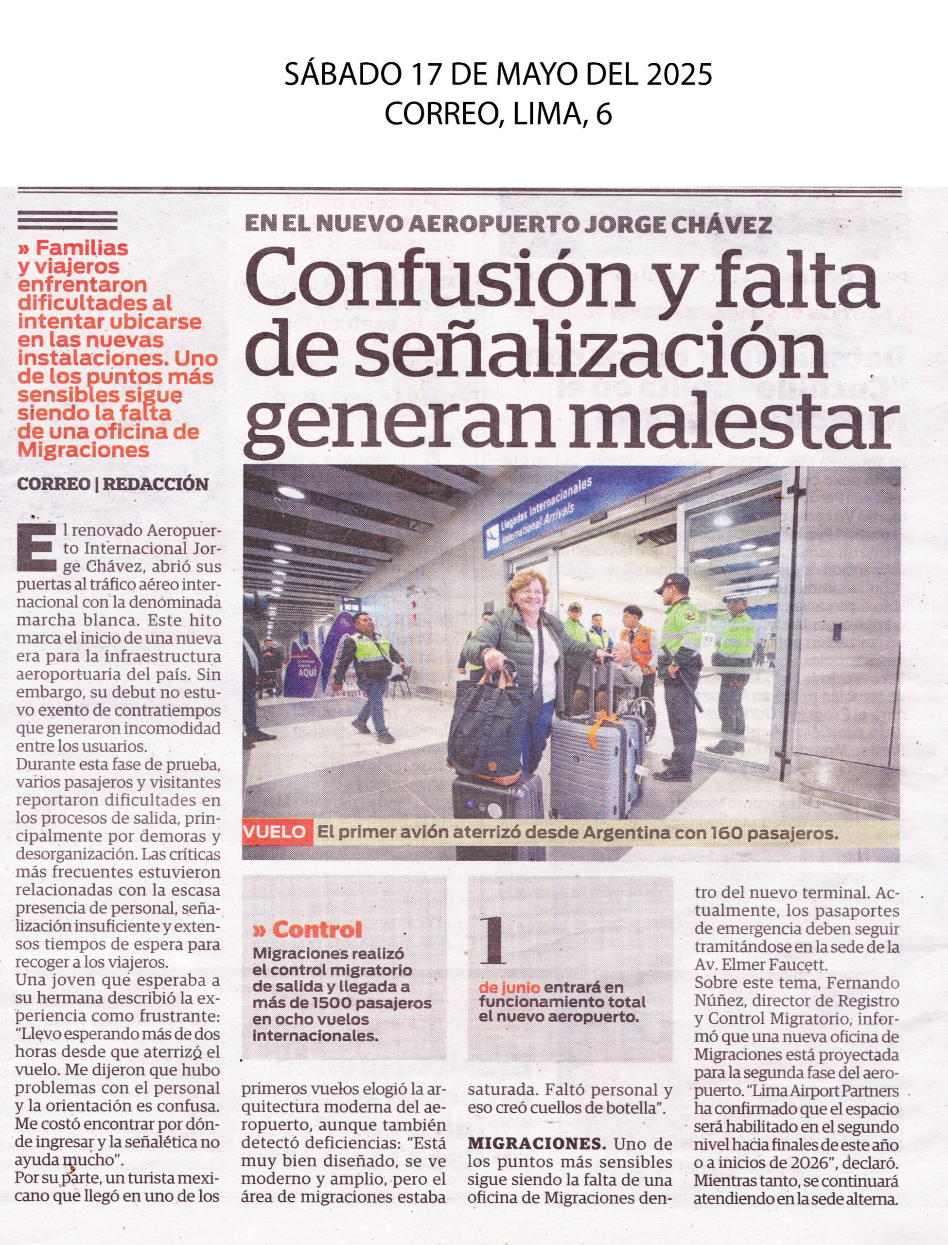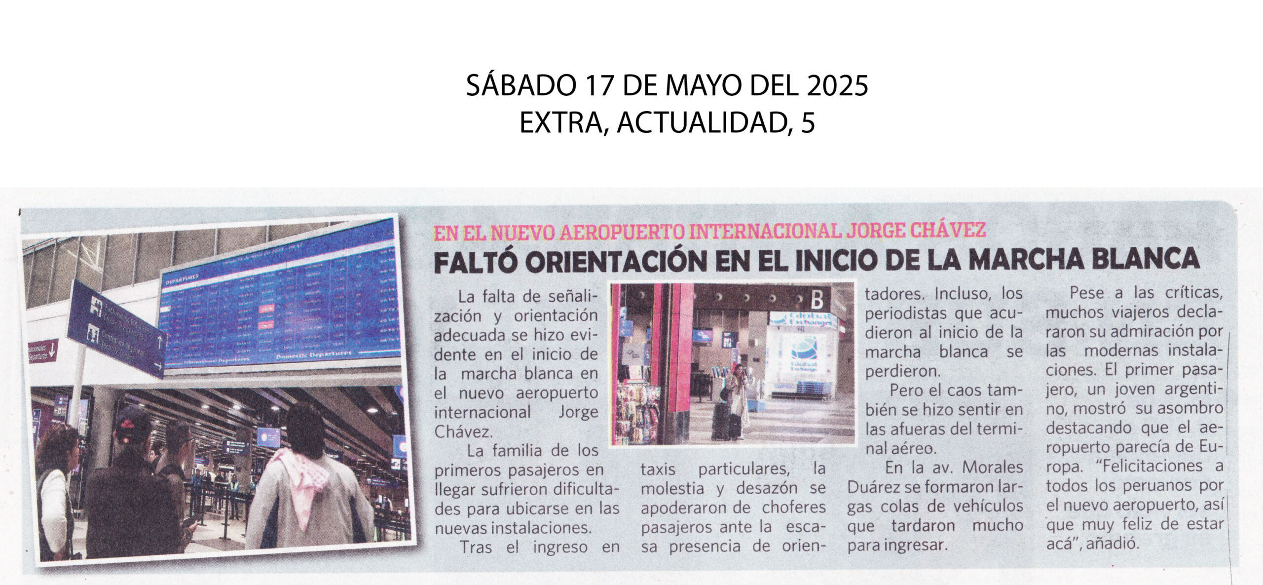 El renovado Aeropuerto Internacional Jorge Chávez, abrió sus puertas al tráfico aéreo internacional con la denominada marcha blanca. Sin embargo, su debut no estuvo excento de contratiempos que generaron incomidad entre los usuarios. Durante esta fase de prueba, varios pasajeros y visitants reportaron dificultades en los procesos de salida, principalmente por las demoras y desorganización. Las críticas más frecuentes estuvieron relacionadas con la escaza presencia de personal, señalización insufiuciente y extensos tiempos de espera para recoger a los viajeros.