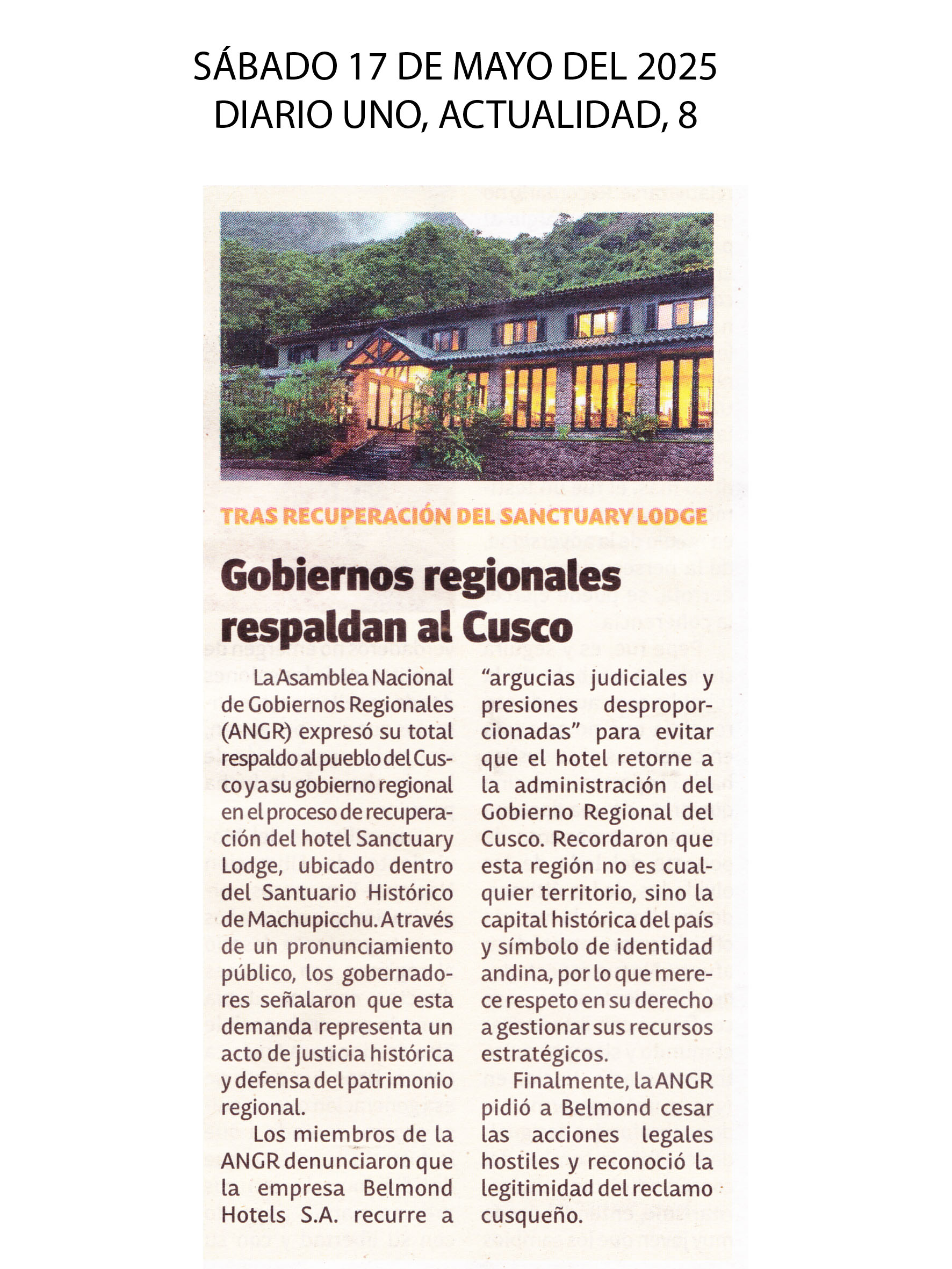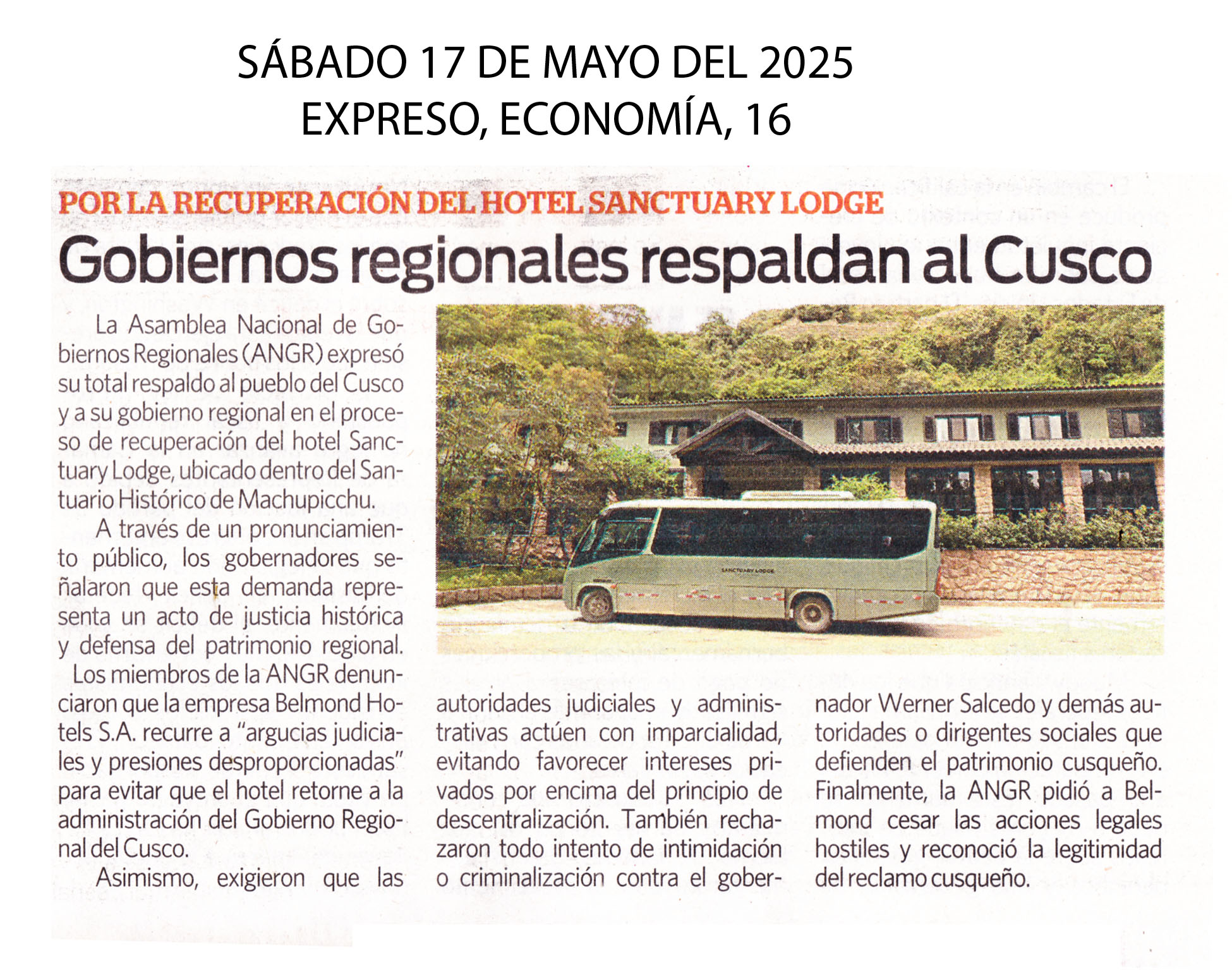 La Asamblea Nacional de Gobiernos Regionales (ANGR) expresó su total respaldo al pueblo del Cusco y a su gobierno regional en el proceso de recuperación del hotel Sanctuary Lodge, ubicado dentro del Santuario Histórico de Machupicchu. A través de un pronunciamiento público, los gobernadores señalaron que esta demanda representa un acto de justicia histórica y defensa del patrimonio regional.