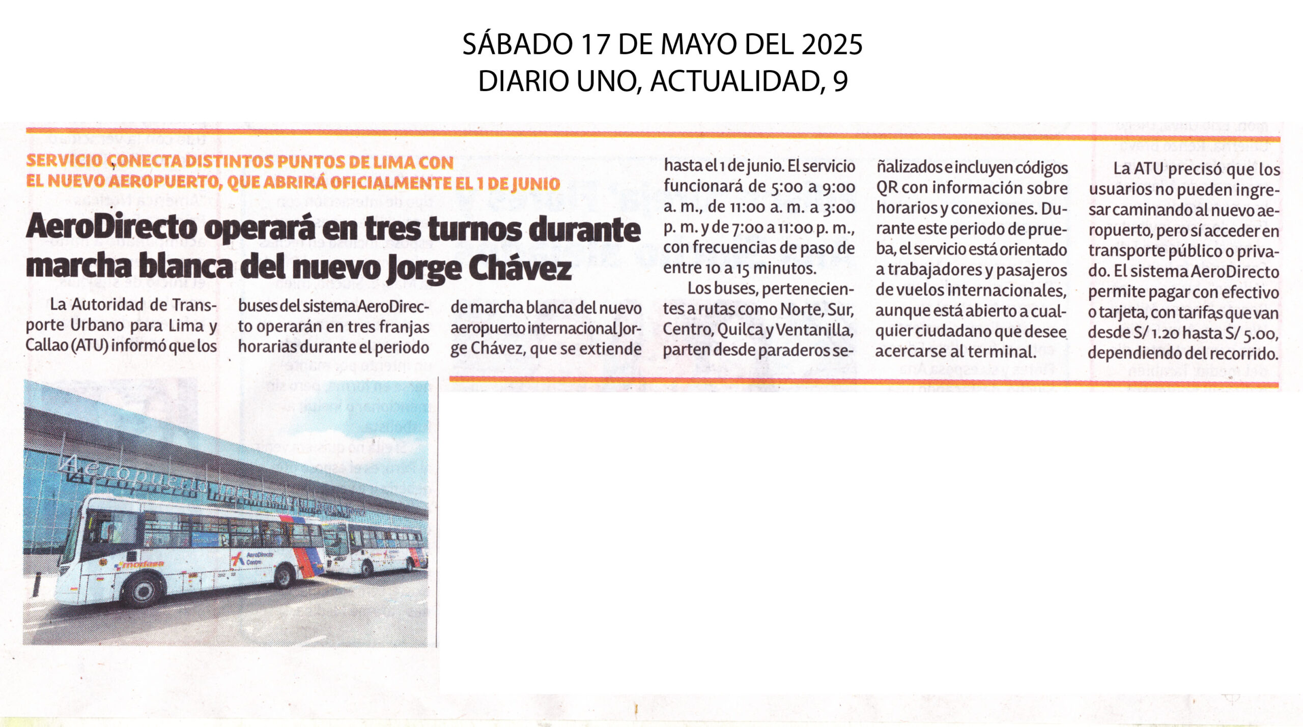 Durante la marcha blanca del nuevo Aeropuerto Internacional Jorge Chávez, los buses del AeroDirecto operan en tres franjas horarias de 5 a 9 am, de 11 am a 3pm y de 7pm a 11 pm. Se indicó que cuenta con un sistema multipage donde los pasajeros pueden abonar en efectivo o con tarjetas siendo las tarifas que van desde S/ 1.20 hasta S/ 5.00, dependiendo de la ruta. Los recorridos de los servicios expresos al aeropuerto son: del AeroDirecto Norte sale del cruce de las avenidas Izaguirre y Universitaria. Del AeroDirecto Sur del cruce las avenidas República Dominicana y Brasil. Del AeroDirecto Centro de la avenida Alfonso Ugarte con Nicolás de Piérola. Del AeroDirecto Quilca (Callao) inicia su recorrido en la av. Quilca y continúa por Faucett y Morales Duárez y finalmente el AeroDirecto Ventanilla que recorre toda la av. Néstor Gambetta, toma la av. Faucett y continua por la av. Morales Duárez.