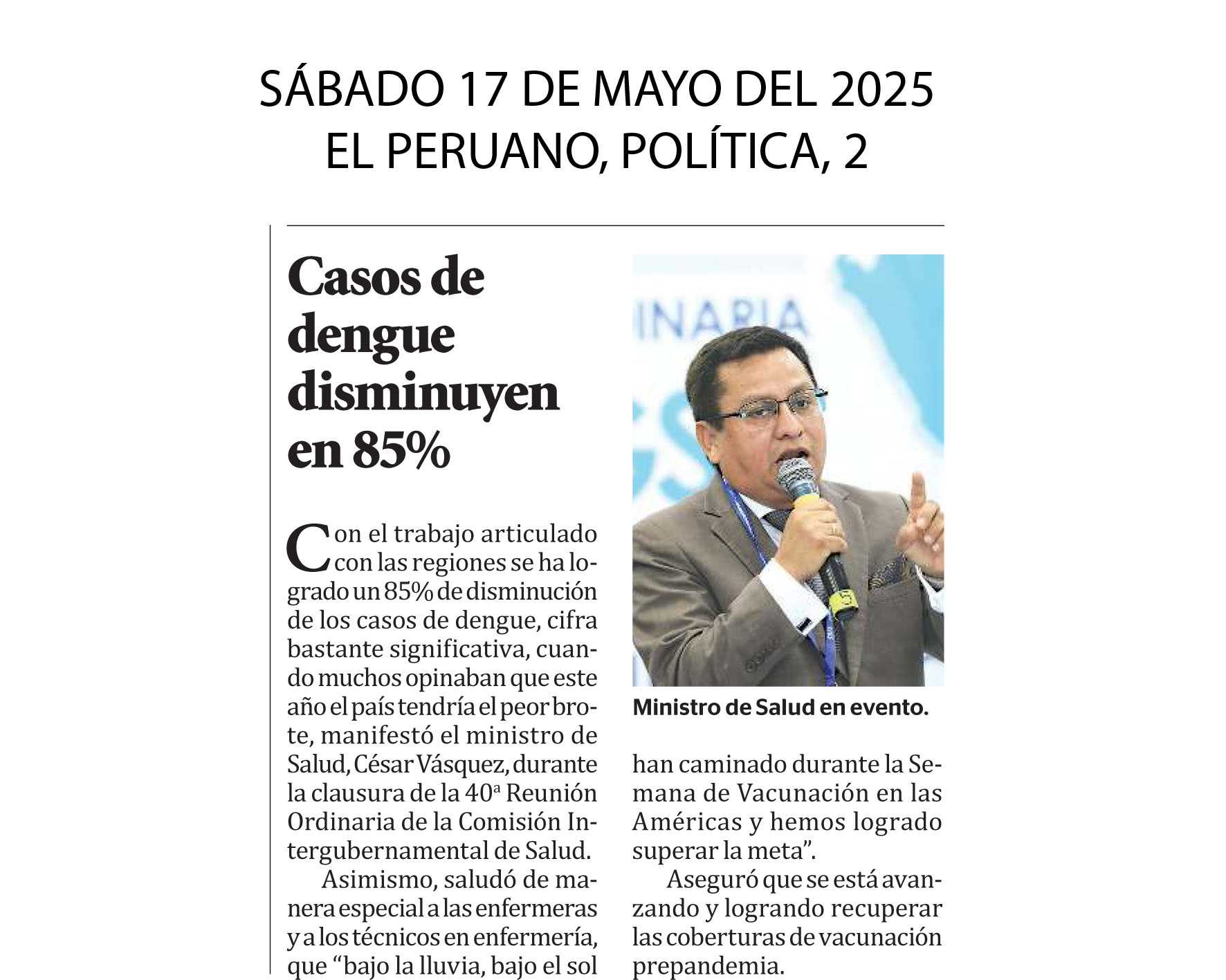 Con el trabajo articulado con las regiones se ha logrado un 85% de disminución de los casos de dengue, cifra bastante significativa, cuando muchos opinaban que este año el país tendría el peor brote, manifestó el ministro de Salud, César Vásquez, durante la clausura de la 40a Reunión Ordinaria de la Comisión Intergubernamental de Salud. Asimismo, saludó de manera especial a las enfermeras y a los técnicos en enfermería, que “bajo la lluvia, bajo el sol han caminado durante la Semana de Vacunación en las Américas y hemos logrado superar la meta”.
