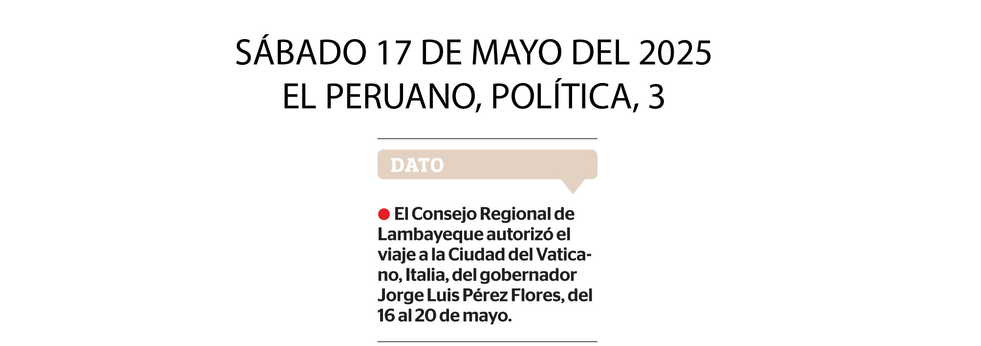El gobernador regional de Lambayeque, Jorge Pérez Flores, viajó al Vaticano para asistir a la entronización del papa León XIV. A pesar de no contar con una invitación oficial, justificó su viaje argumentando que su presencia en la ceremonia ayudará a fomentar el turismo en la región. La autoridad comentó que le pedirá al sumo pontífice que visite el norte del Perú. El Consejo Regional aprobó el viaje mediante una sesión extraordinaria, destinando más de 130 mil soles para cubrir los costos de la delegación, que incluye a cuatro consejeros regionales.