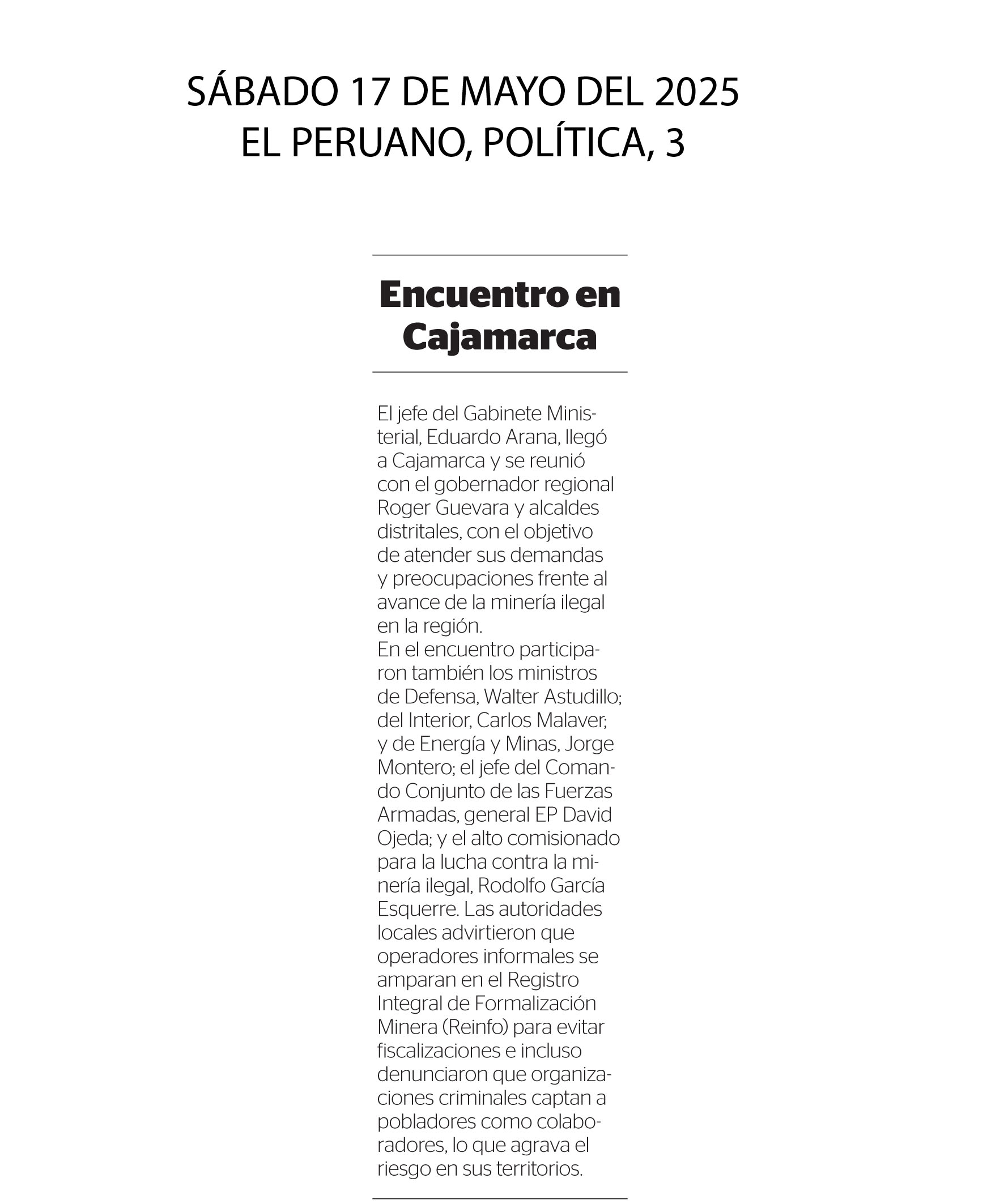 El jefe del Gabinete Ministerial, Eduardo Arana, llegó a Cajamarca y se reunió con el gobernador regional Roger Guevara y alcaldes distritales, con el objetivo de atender sus demandas y preocupaciones frente al avance de la minería ilegal en la región. En el encuentro participaron también los ministros de Defensa, Walter Astudillo; del Interior, Carlos Malaver; y de Energía y Minas, Jorge Montero; el jefe del Comando Conjunto de las Fuerzas Armadas, general EP David Ojeda; y el alto comisionado para la lucha contra la minería ilegal, Rodolfo García Esquerre. Las autoridades locales advirtieron que operadores informales se amparan en el Registro Integral de Formalización Minera (Reinfo) para evitar fiscalizaciones.