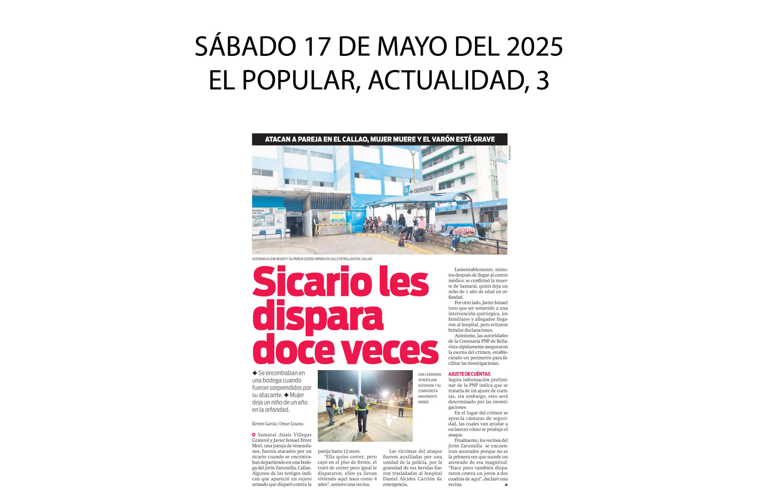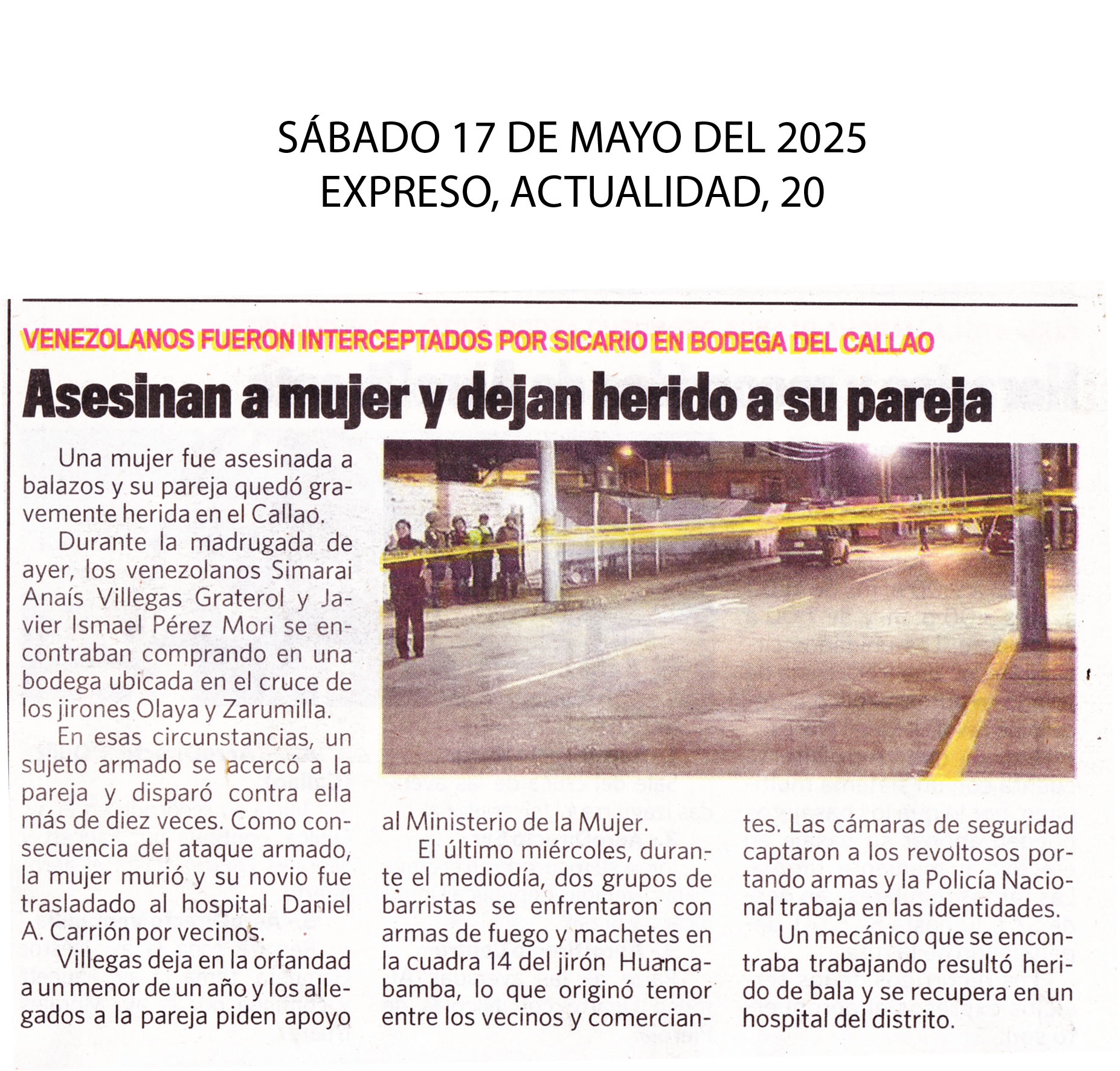 Una mujer fue asesinada a balazos y su pareja quedó gravemente herida en el Callao. Durante la madrugada de ayer, los venezolanos Simarai Anais Villegas Graterol y Javier Ismael Pérez Mori se encontraban comprando en una bodega ubicada en el cruce de los jirones Olaya y Zarumilla. En esas circunstancias, un sujeto armado se acercó a la pareja y disparó contra ella más de diez veces. Como consecuencia del ataque armado, la mujer murió y su novio fue trasladado al hospital Daniel A. Carrión por vecinos.