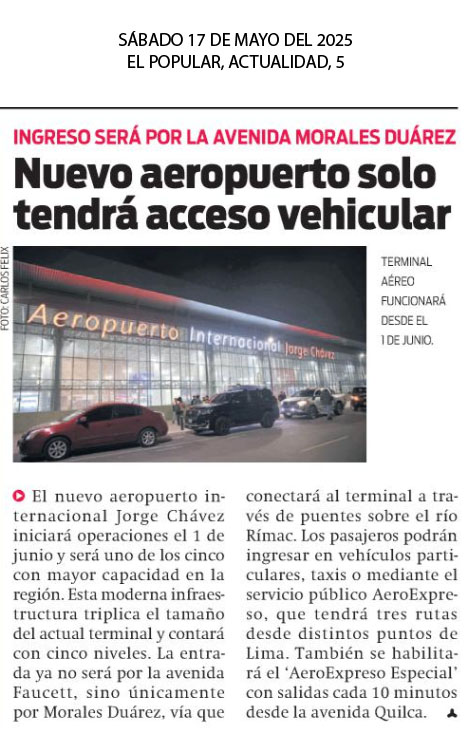 El nuevo aeropuerto internacional Jorge Chávez iniciará operaciones el 1 de junio y será uno de los cinco con mayor capacidad en la región. Esta moderna infraestructura triplica el tamaño del actual terminal y contará con cinco niveles. La entrada ya no será por la avenida Faucett, sino únicamente por la Morales Duárez, vía que conectará al terminal a través de puentes sobre el río Rímac.