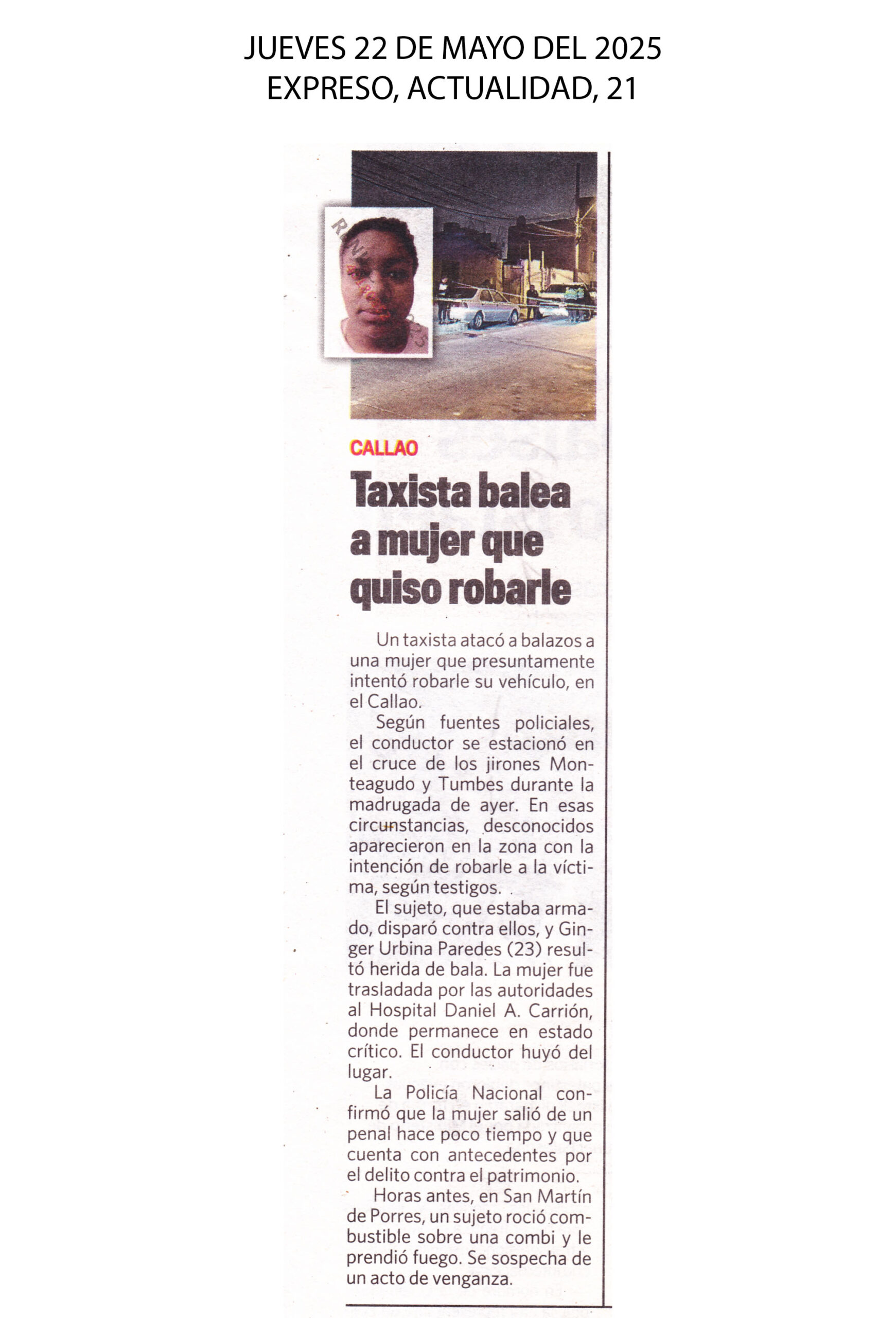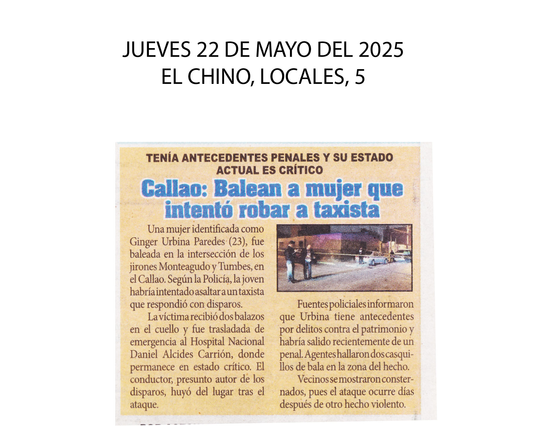 Una mujer resultó herida tras un presunto intento de asalto en pleno centro del Callao, donde sigue vigente el estado de emergencia. En la intersección de los jirones Monteagudo y Tumbes, el conductor de un auto disparó contra una mujer que, presumiblemente, estaba a punto de arrebatarle sus pertenencias. Según las primeras indagaciones, la fémina se acercó sigilosamente a su víctima, quien sacó su arma y la acribilló. La herida, Ginger Urbina Paredes, de 23 años, recibió dos impactos de bala en el cuello y quedó tendida en la vía pública.