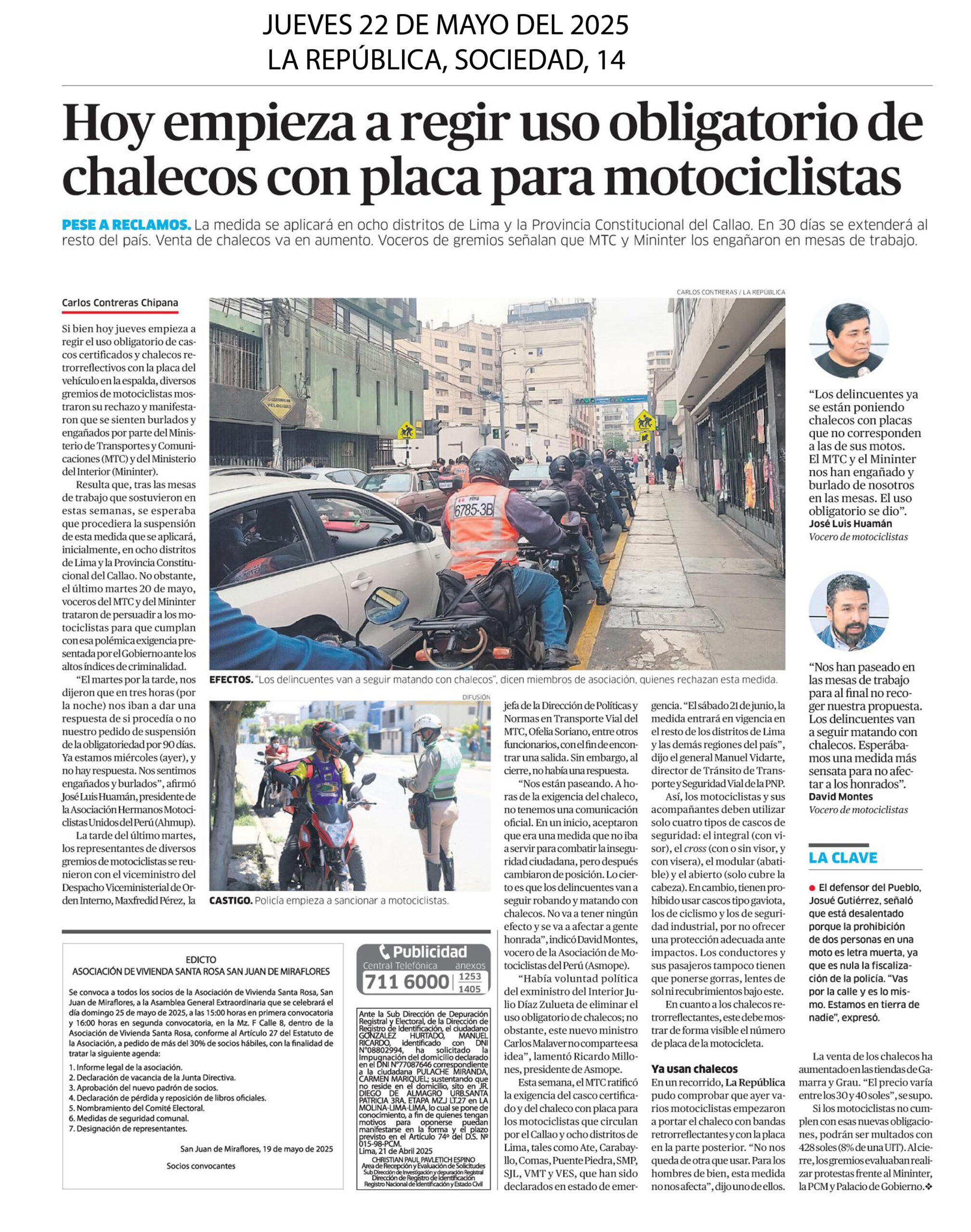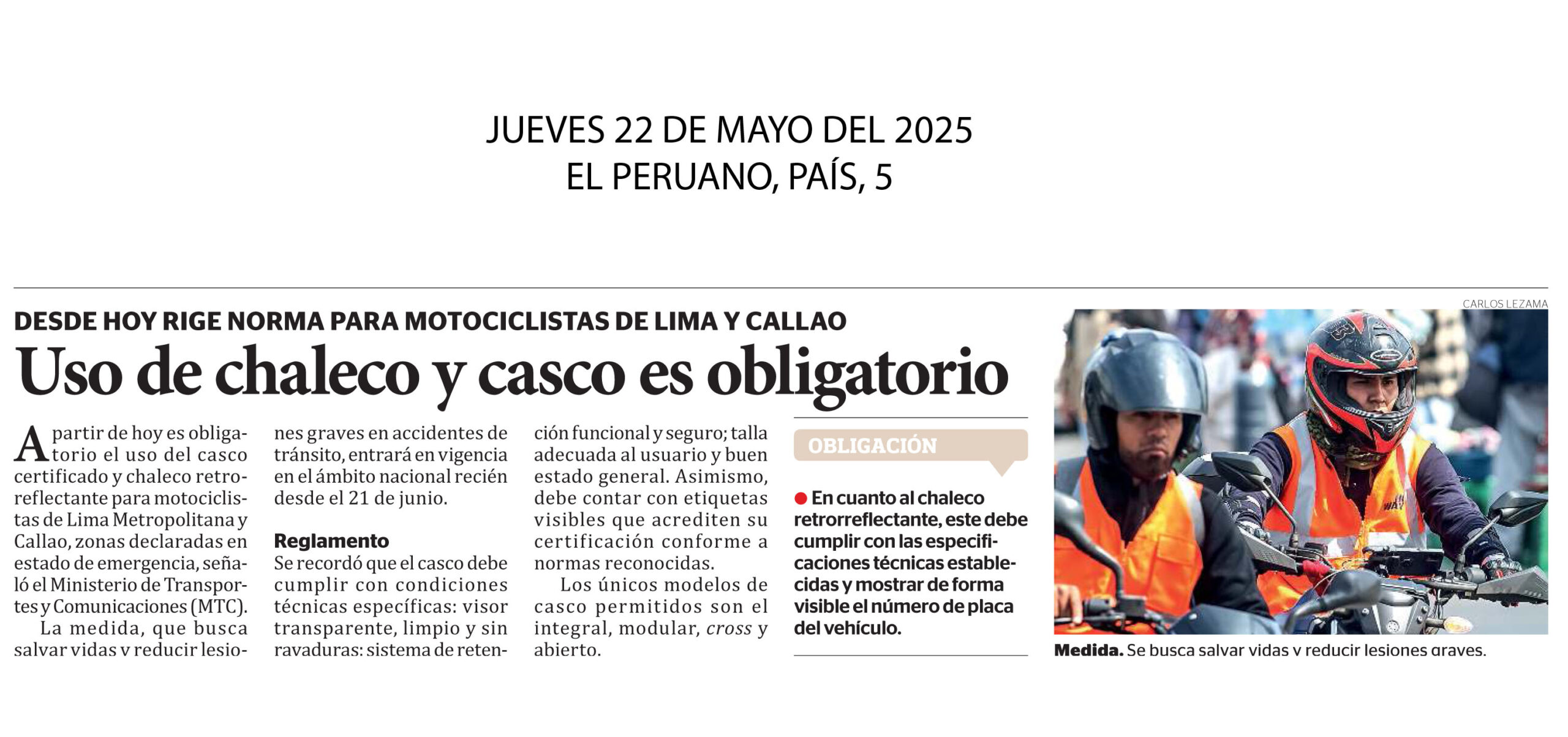 A partir de hoy es obligatorio el uso del casco certificado y chaleco retroreflectante para motociclistas de Lima Metropolitana y Callao, zonas declaradas en estado de emergencia, señaló el Ministerio de Transportes y Comunicaciones (MTC). La medida, que busca salvar vidas y reducir lesiones graves en accidentes de tránsito, entrará en vigencia en el ámbito nacional recién desde el 21 de junio. Se recordó que el casco debe cumplir con condiciones técnicas específicas: visor transparente, limpio y sin rayaduras; sistema de retención funcional y seguro; talla adecuada al usuario y buen estado general. Asimismo, debe contar con etiquetas visibles que acrediten su certificación conforme a normas reconocidas.