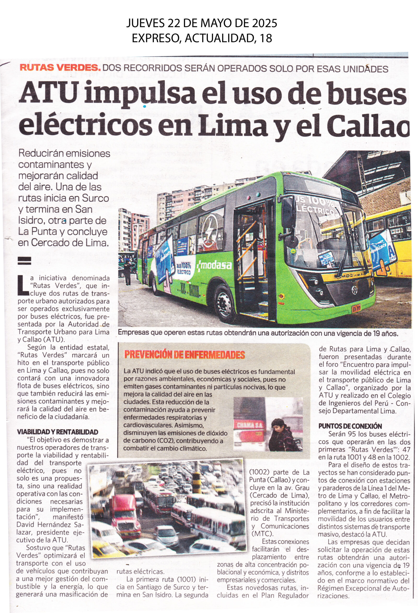 La Autoridad de Transporte Urbano para Lima y Callao (ATU), entidad adscrita al Ministerio de Transportes y Comunicaciones (MTC), presentó ‘Rutas Verdes’, propuesta de dos recorridos autorizados para ser operados exclusivamente por buses eléctricos. ‘Rutas Verdes’ marcará un hito en el transporte público en Lima y Callao. No solo contará con una innovadora flota de buses eléctricos, sino que también reducirá las emisiones contaminantes y mejorará la calidad del aire en beneficio de la ciudadanía.