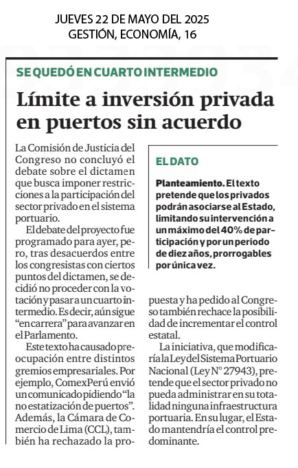 La Comisión de Justicia del Congreso de la República de Perú no concluyó el debate sobre el dictamen que busca imponer restricciones a la participación del sector privado en el sistema portuario peruano. El debate del proyecto fue programado para ayer, pero, tras desacuerdos entre los congresistas con ciertos puntos del dictamen, se decidió no proceder con la votación y pasar a un cuarto intermedio. Es decir, aún sigue “en carrera” para avanzar en el Parlamento.