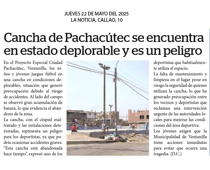 En el Proyecto Especial Ciudad Pachacútec, Ventanilla, los niños y jóvenes juegan fútbol en una cancha en condiciones deplorables, situación que generó preocupación debido al riesgo de accidentes. Al lado del campo se observó gran acumulación de basura, lo que evidencia el abandono de la zona. La cancha, con el césped maltratado y las instalaciones deterioradas, representa un peligro para los deportistas, ya que podría ocasionar accidentes graves. “Esta cancha está abandonada hace tiempo”, expresó uno de los deportistas que habitualmente utiliza el espacio.