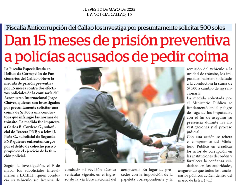 La Fiscalía Especializada en Delitos de Corrupción de Funcionarios del Callao obtuvo la medida de prisión preventiva por 15 meses contra dos efectivos policiales de la comisaría del Aeropuerto Internacional Jorge Chávez, quienes son investigados por presuntamente solicitar una coima de S/ 500 a una conductora que infringió las normas de tránsito.